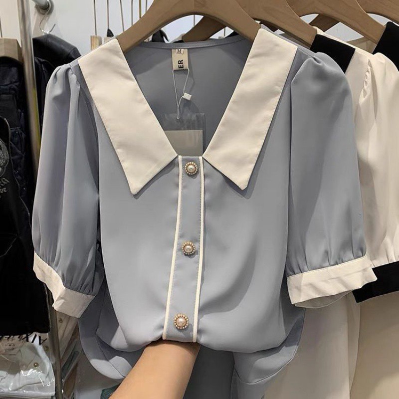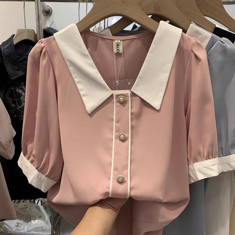 | nameOriginal | Doll Collar Contrast Chiffon Shirt Women's Short-sleeved Summer New Pullover Stylisch Age-reducing Elegant Small Shirt Top |