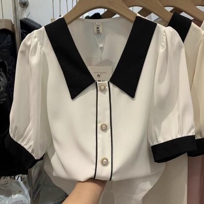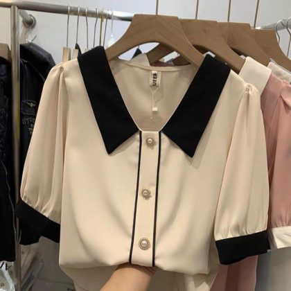 | nameOriginal | Doll Collar Contrast Chiffon Shirt Women's Short-sleeved Summer New Pullover Stylisch Age-reducing Elegant Small Shirt Top |