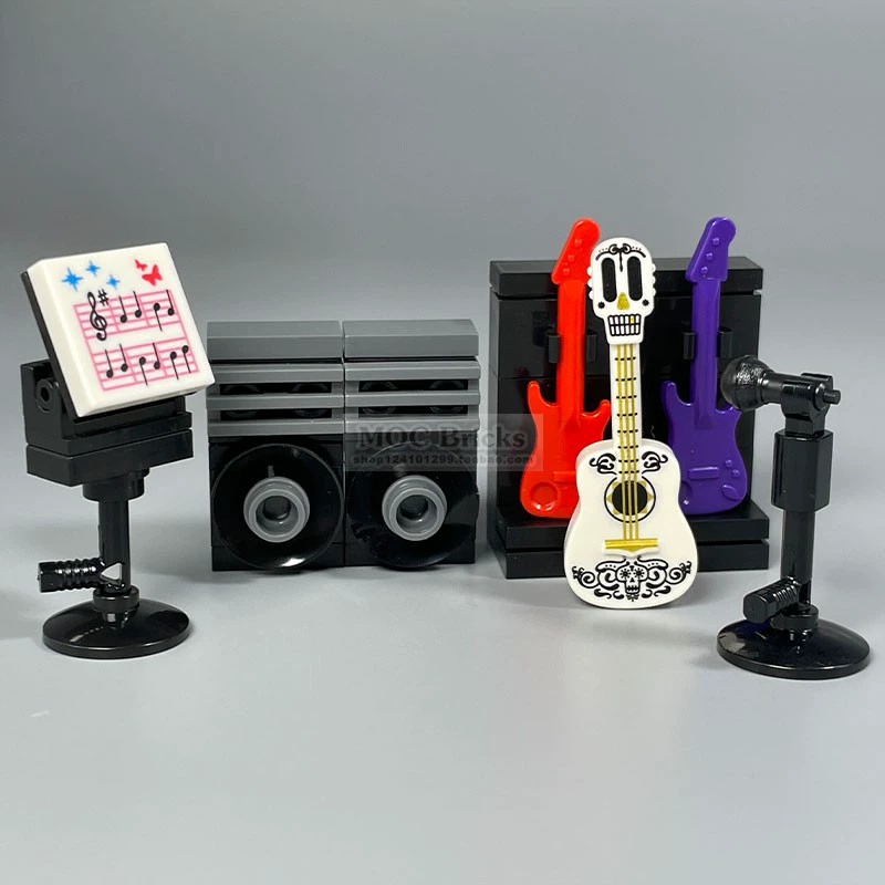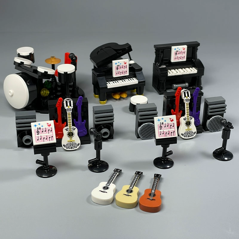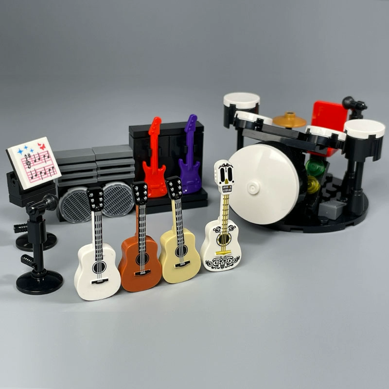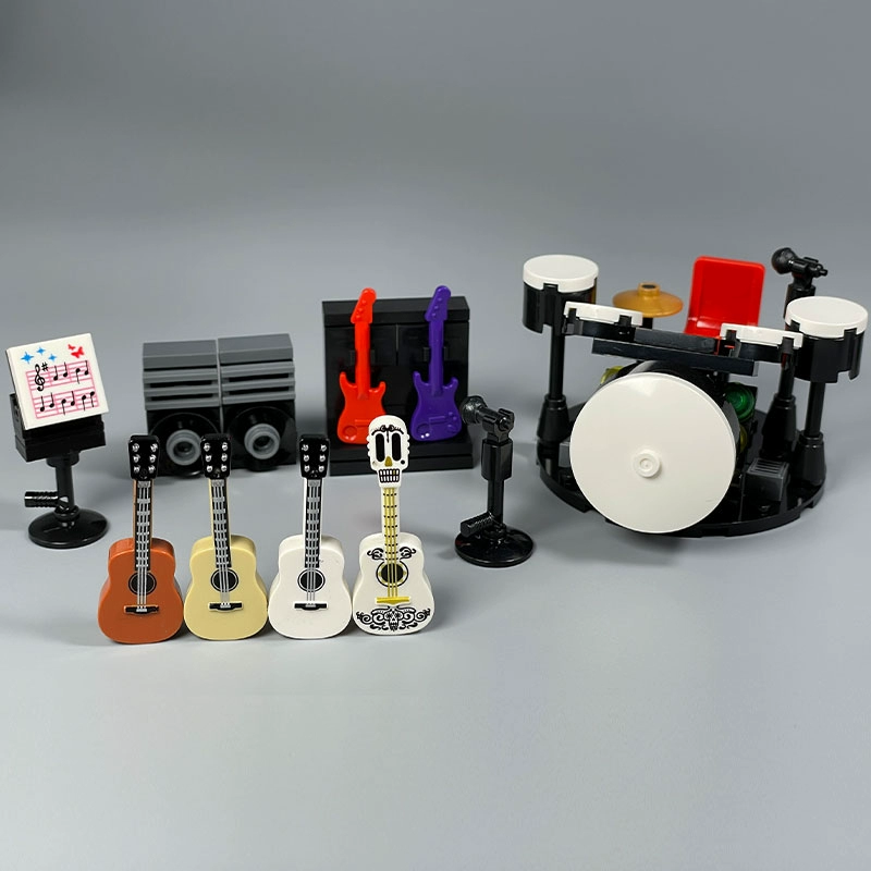 | nameOriginal | Domestic assembled building blocks toys musical instruments piano drums guitar bass saxophone audio microphone stage scene |