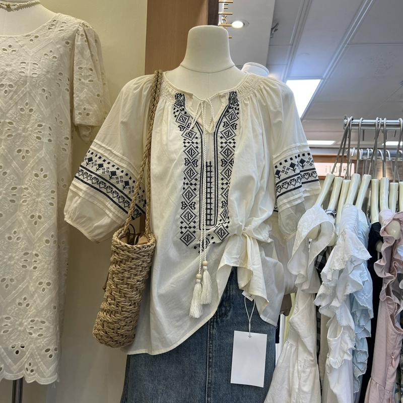 Dongdaemun Korean style pastoral style half-sleeve tie embroidery
