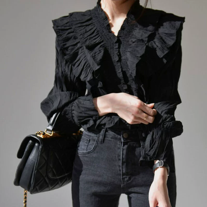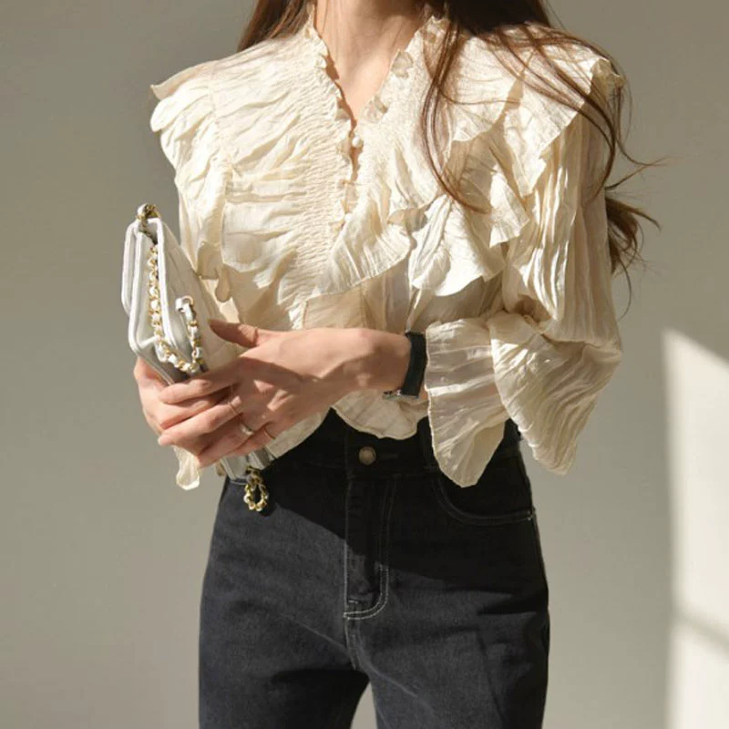 | nameOriginal | Dongdaemun V-neck pleated ruffled loose shirt |