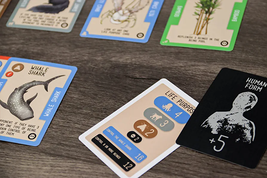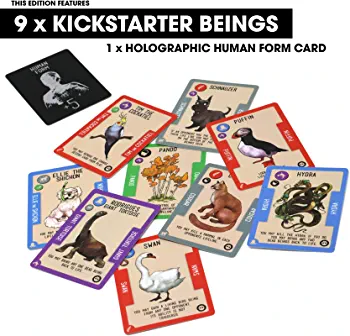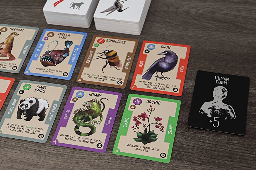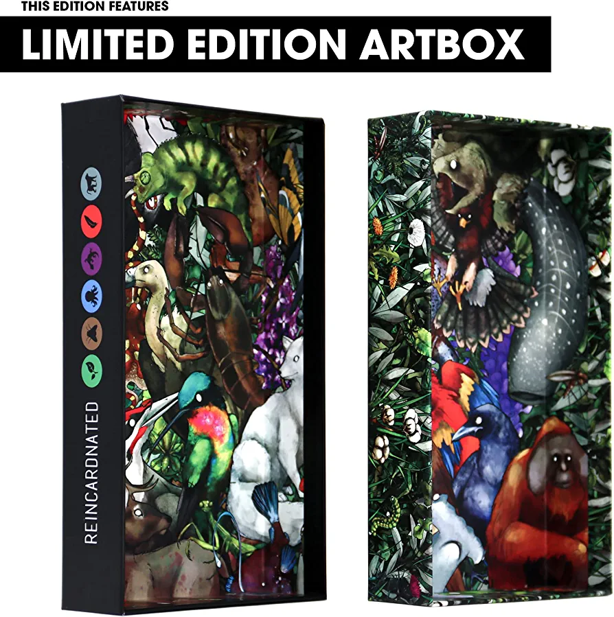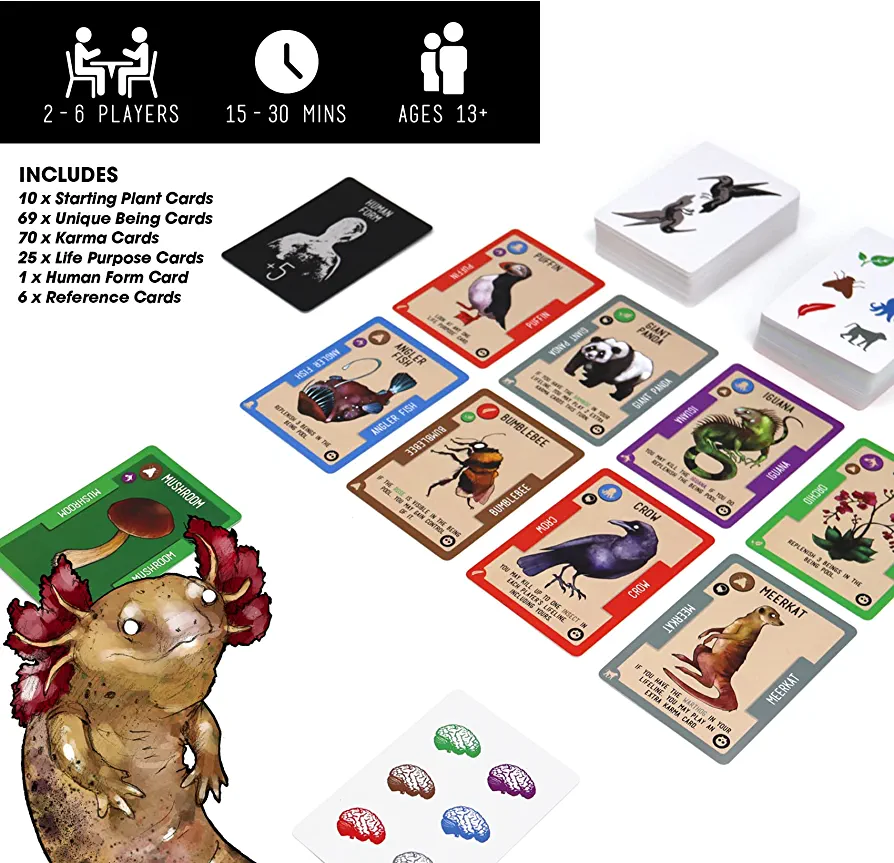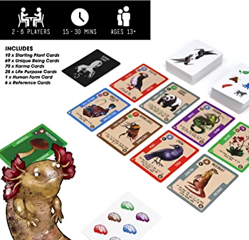 Reincardnated is a strategic game that can be played by 2-6 players and is centered around the concept of reincarnation. At the beginning of the game, each player starts as a ‘Starter Being’, which is one of ten plants in the game. Players are then given a ‘Life Purpose’ card that outlines the goals and being types that they should aim to incarnate during the game. Throughout the game, players take turns incarnating one of the 69 unique beings available, which creates their ‘Life Line’. By doing so, players earn ‘Karma’ cards that can be used to impact their own ‘Life Lines’ and those of their opponents. These cards can be used to kill or revive beings, force unexpected incarnations, and view ‘Life Purposes’ to better strategize. The game ends when a player reincarnates into the ‘Human Form’. At this point, players reveal their unique ‘Life Purpose’ cards and tally up their scores. The player with the highest score wins. The Kickstarter/First Edition of Reincardnated by Doolittle Gaming includes a total of 69 beings that can be reincarnated, with 8 exclusive cards that will not be available in future prints. These exclusive cards were generated by Kickstarter backers and included as a special ‘Thank You’ to the community for helping to bring the game to life. The full game consists of 181 poker-sized cards.