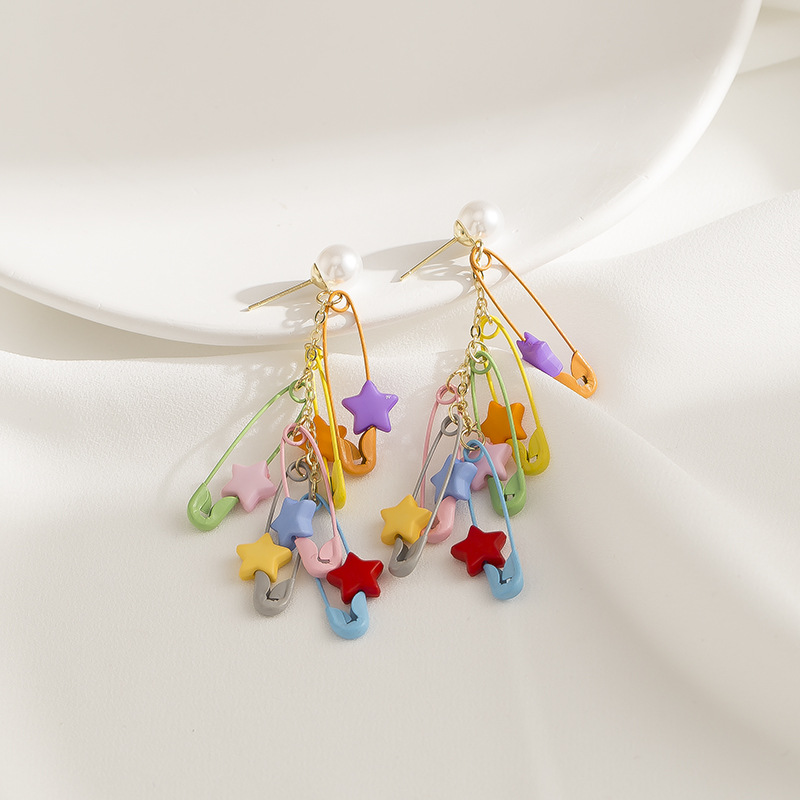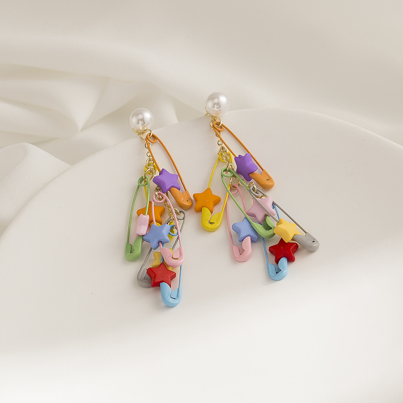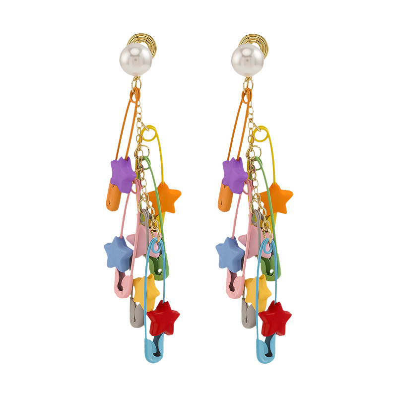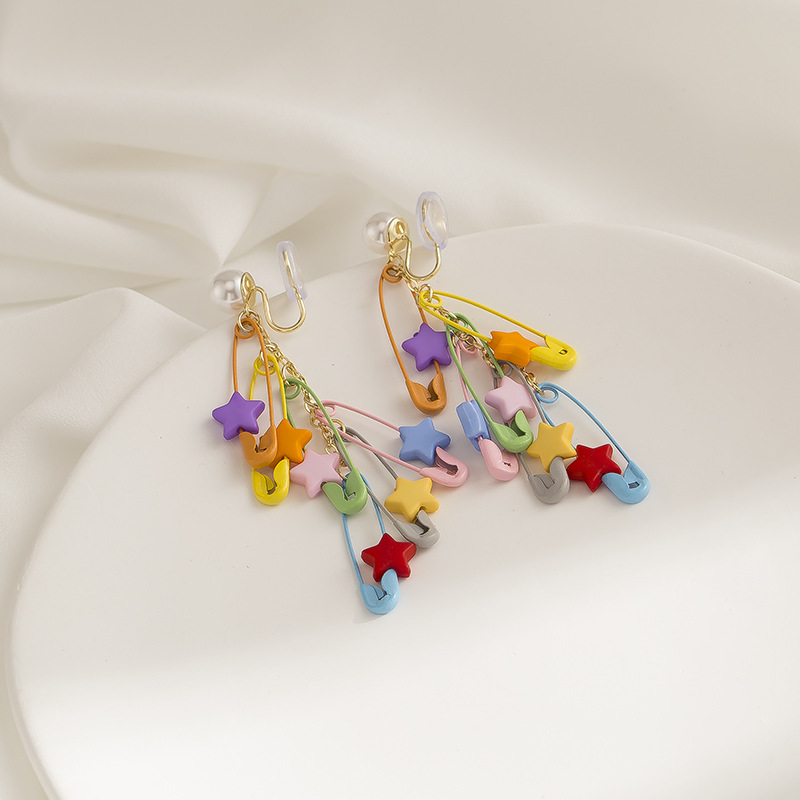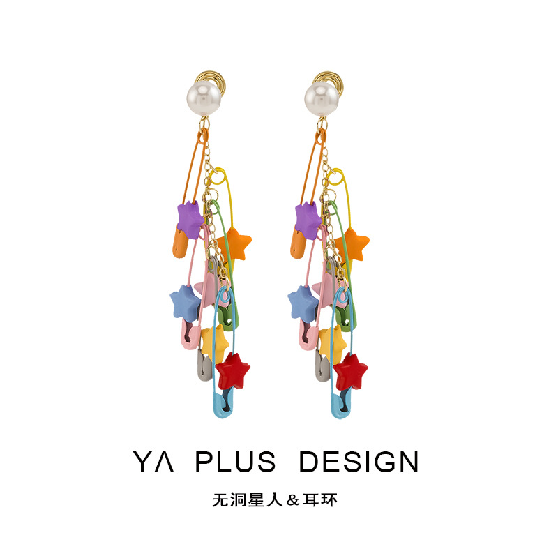 Dopamine color pin ear studs niche personality star long tassel earrings mosquito coil ear clip without pierced female