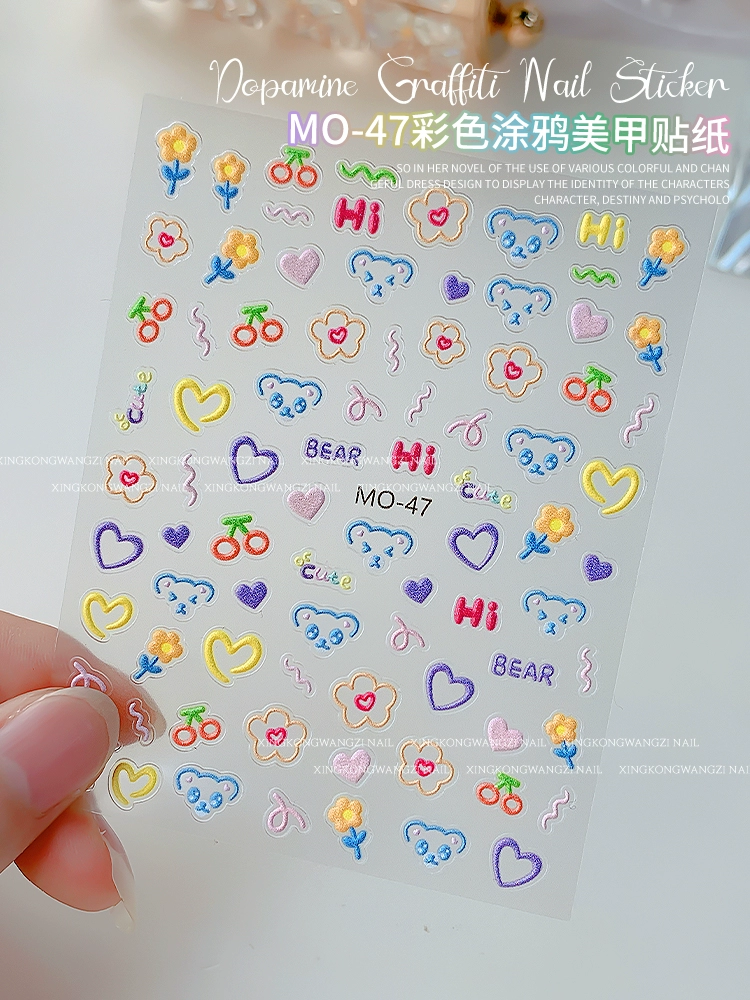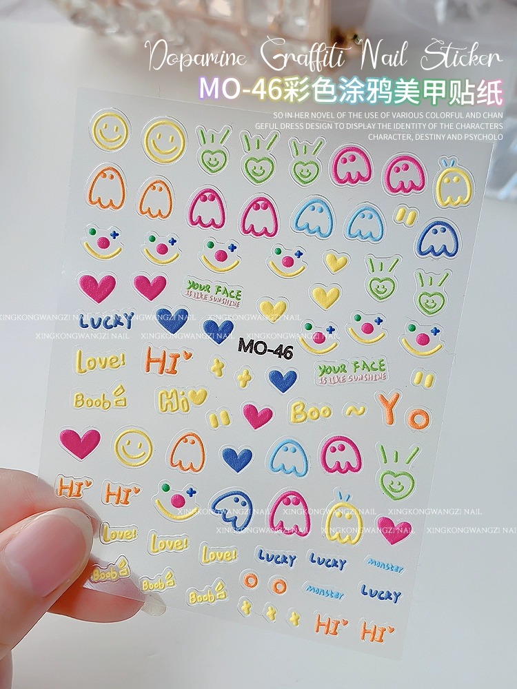 | nameOriginal | Dopamine nail art graffiti stickers cute lines love smiley colorful relief three-dimensional adhesive nail decorations |