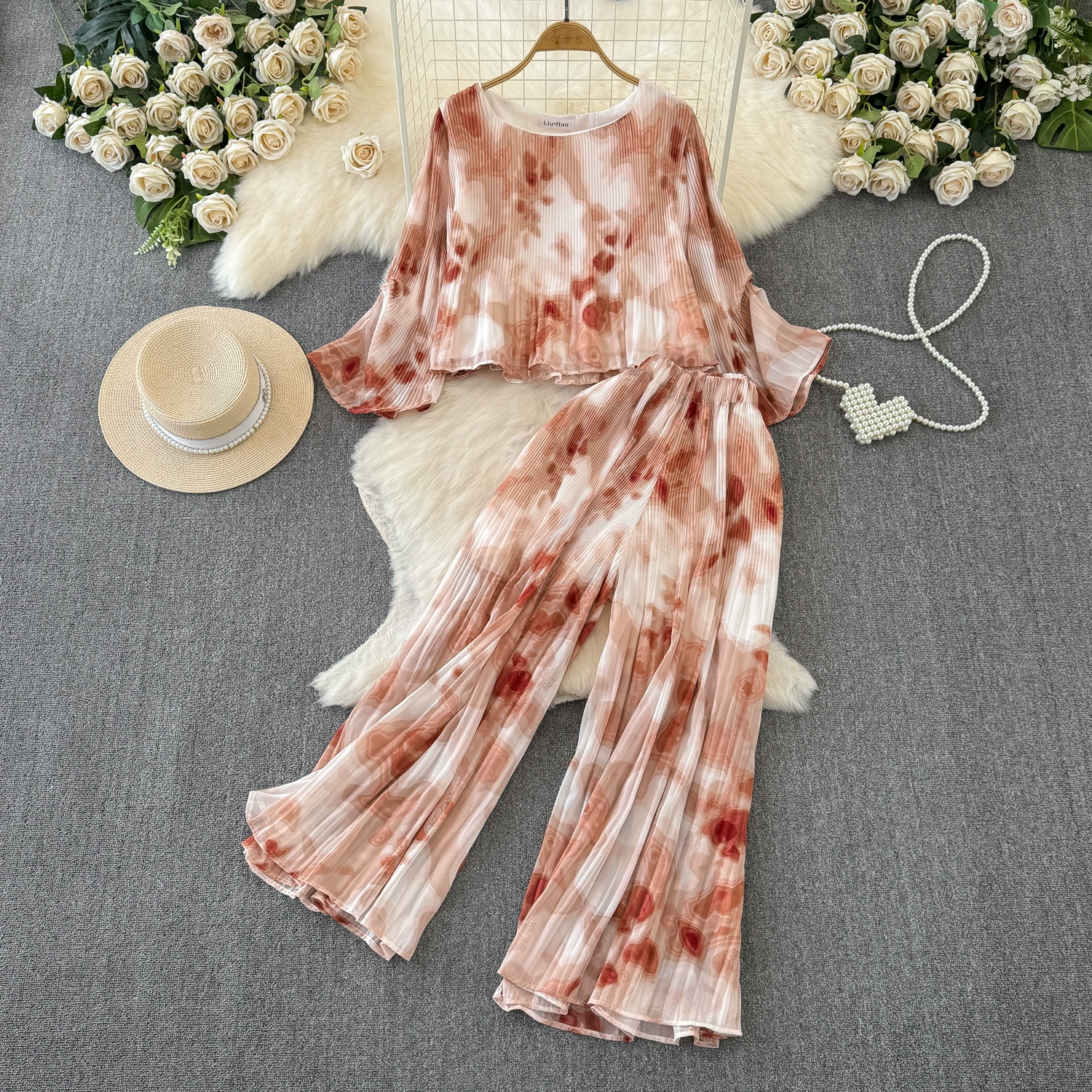 | nameOriginal | Dopamine Royal Sister Pure Desire Fashion Two-piece Set Women's 2024 Summer Loose Tie-Dye Top + Drapey High-Waist Pants |