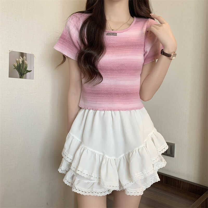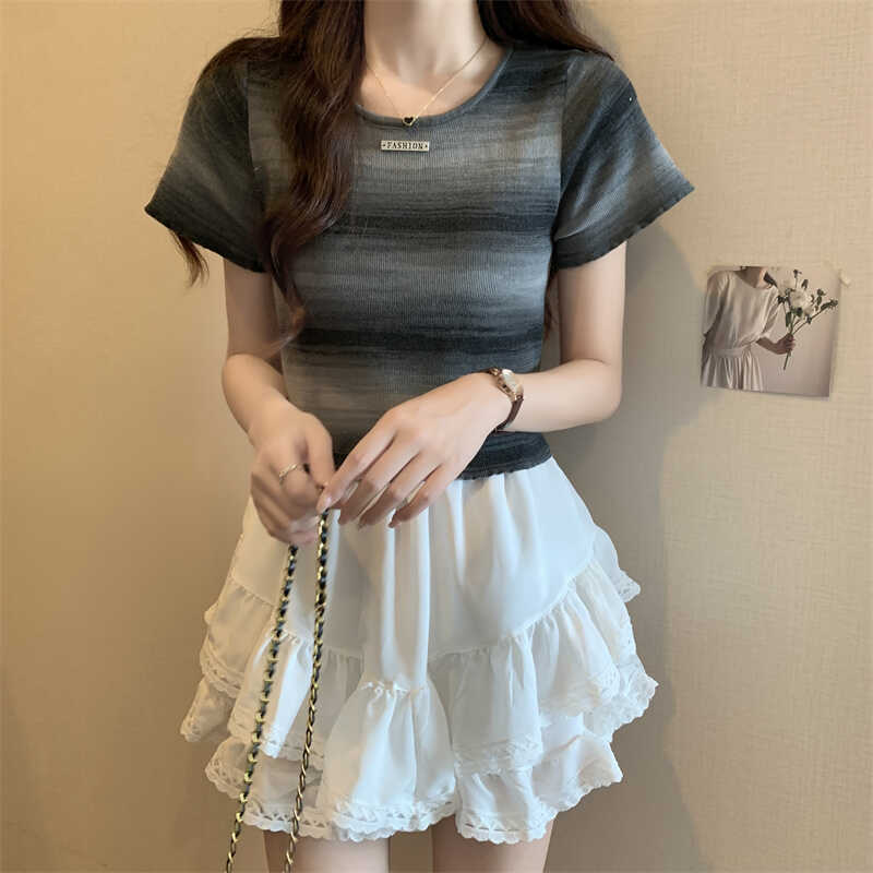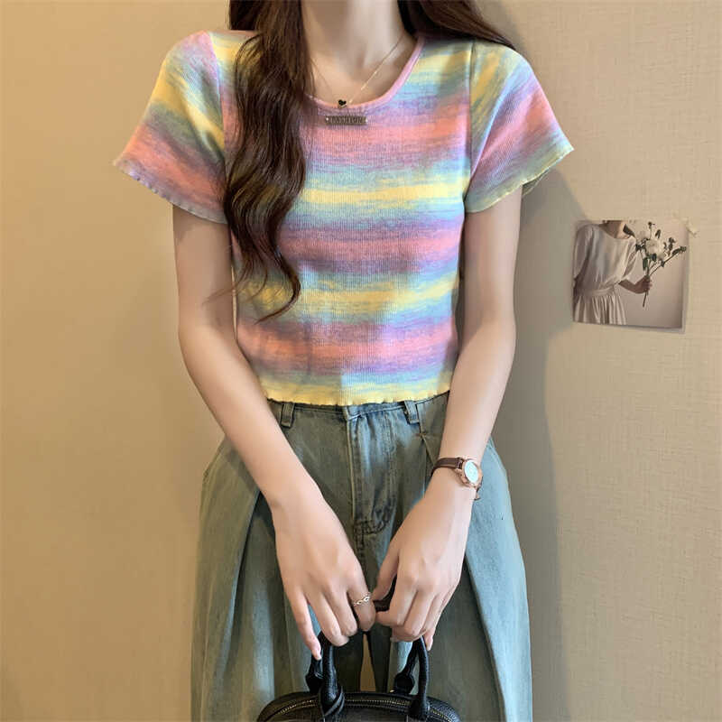 | nameOriginal | Dopamine Striped Short-sleeved Shoulder T-shirt Knit Women's 2024 Summer Niche Chic Design Sense Short Top |