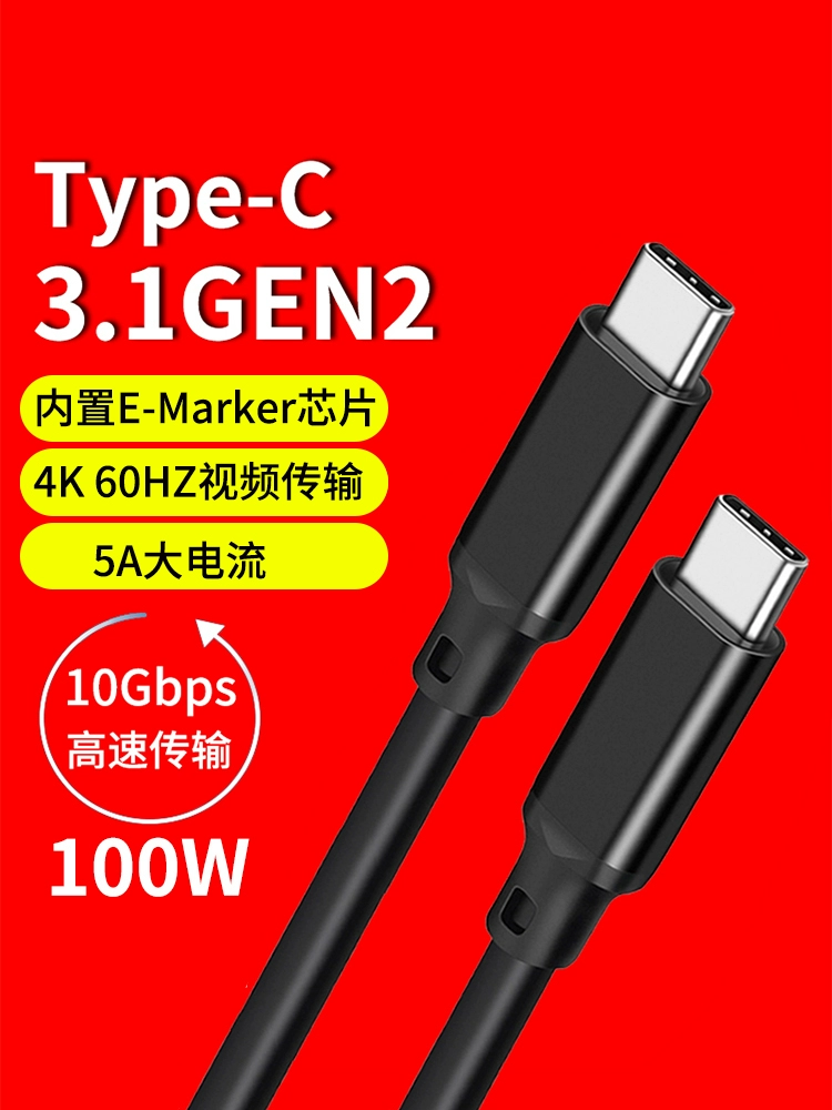 Double-headed Type-C male-to-male 5A fast charging USB-C data cable PD100W charging USB3.1GEN2 video 4K display screen projection CTOC suitable for Apple notebook Huawei Samsung