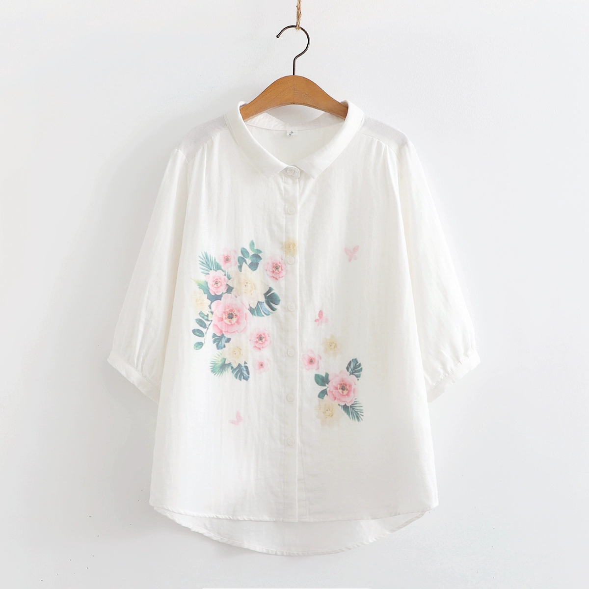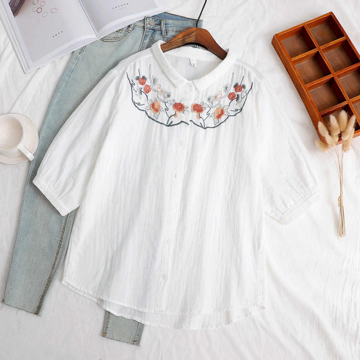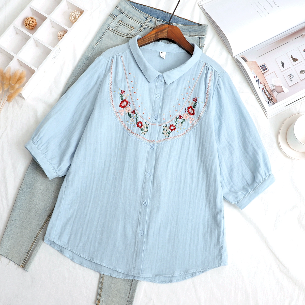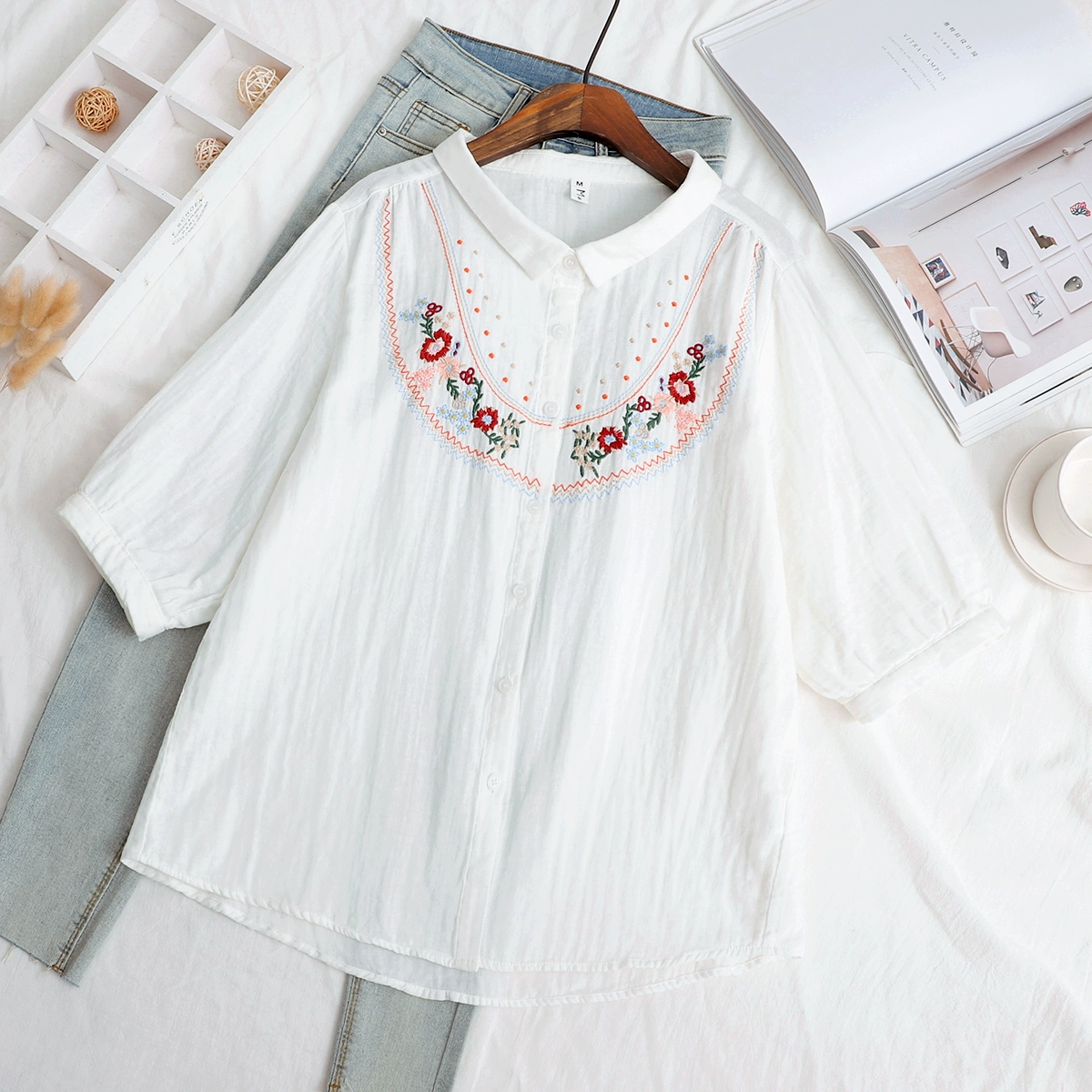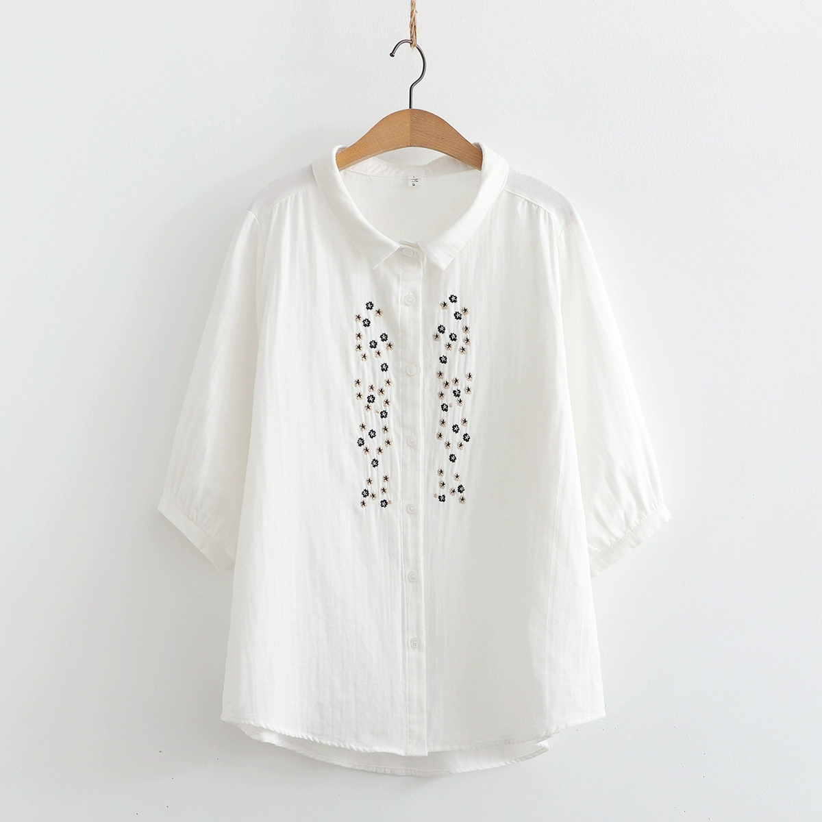 | nameOriginal | Double-layer cotton gauze small fresh flower embroidered mid-sleeve shirt |