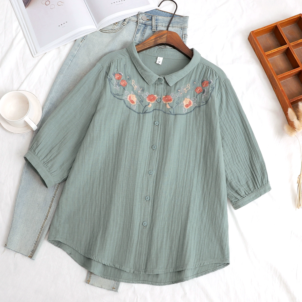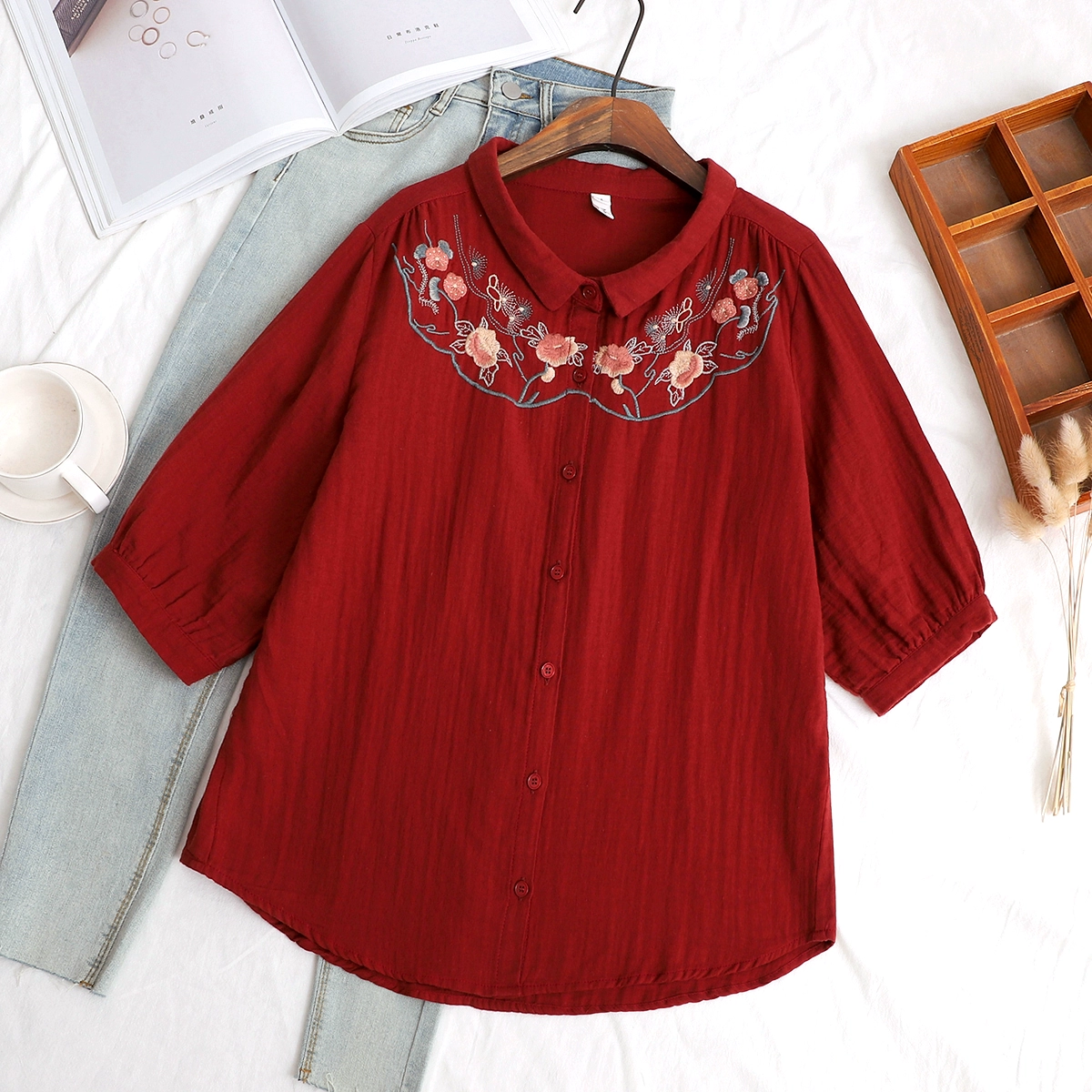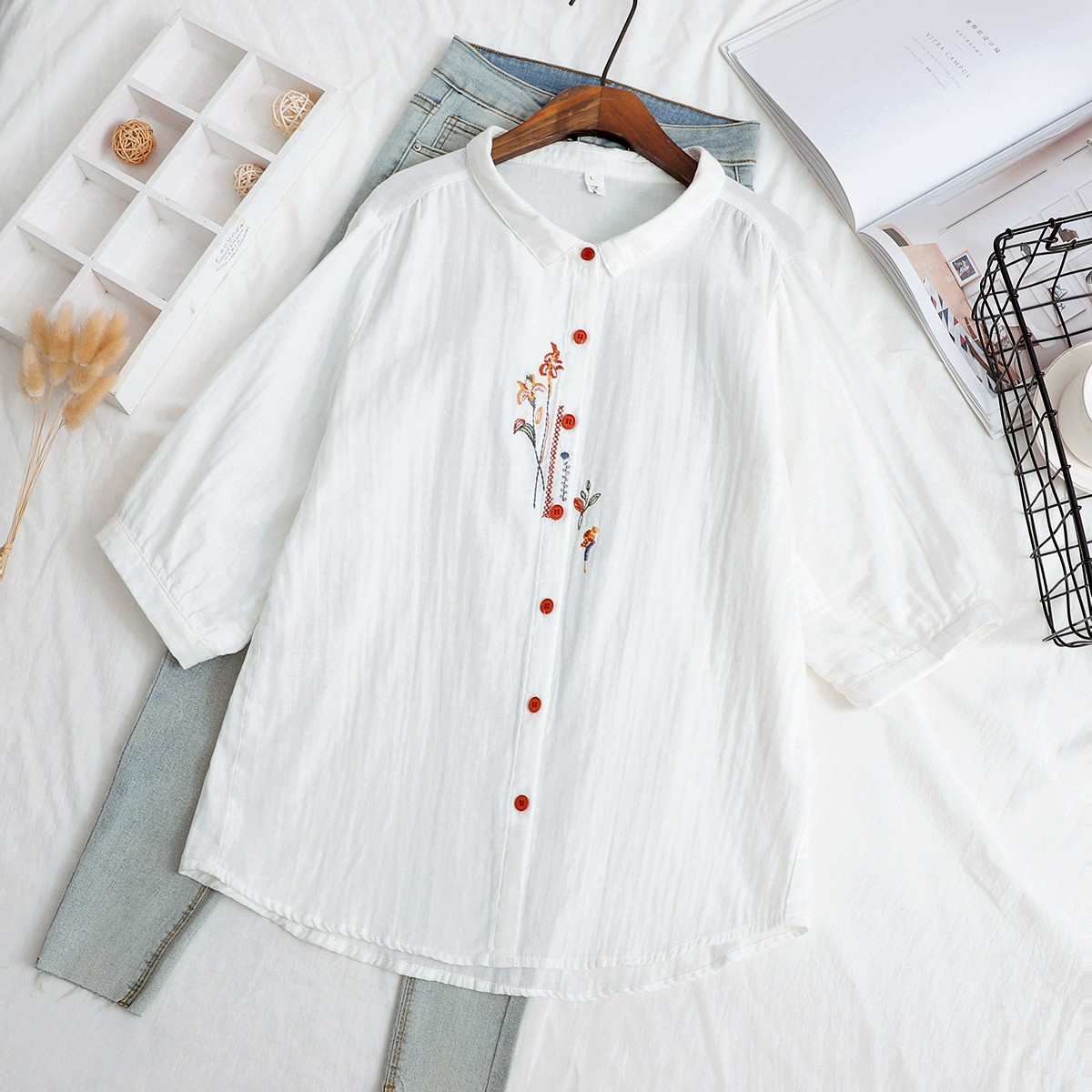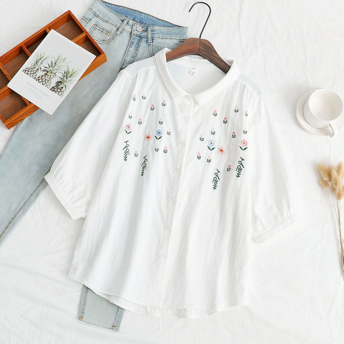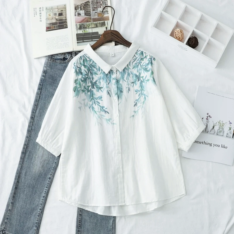 | nameOriginal | Double-layer cotton gauze small fresh flower embroidered mid-sleeve shirt |