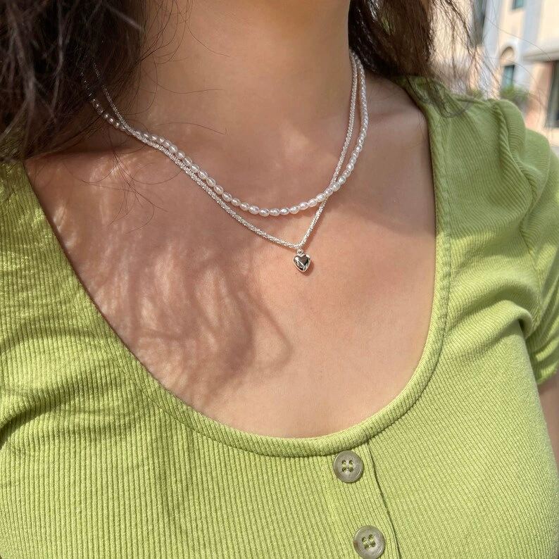 Double layered peach heart sparkling pearl necklace