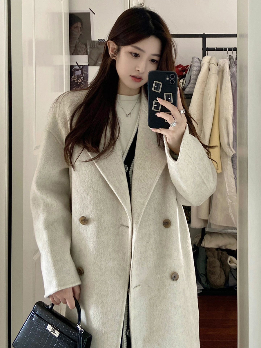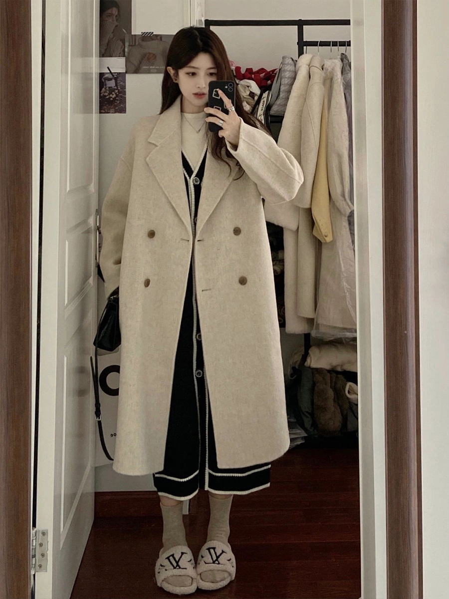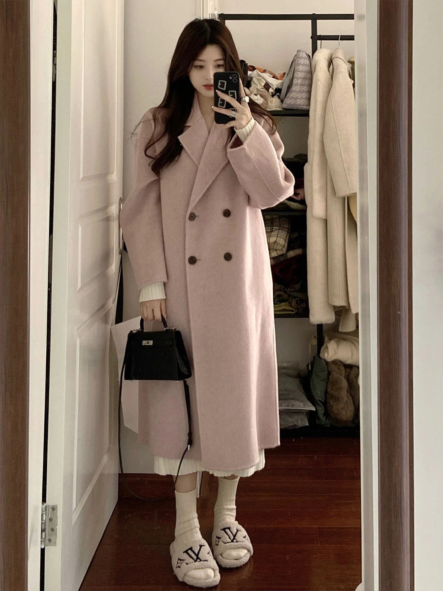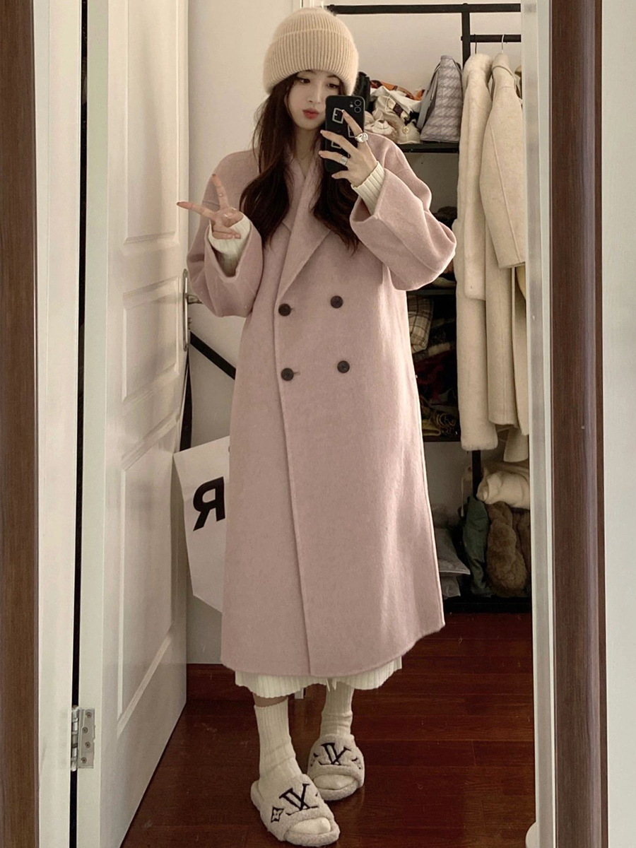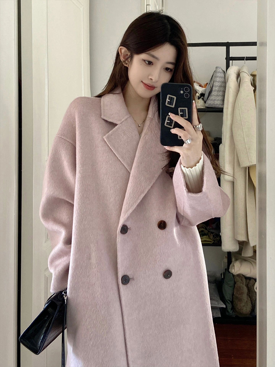Double-sided cashmere smoky pink woolen coat for women winter small British style Hepburn style woolen coat