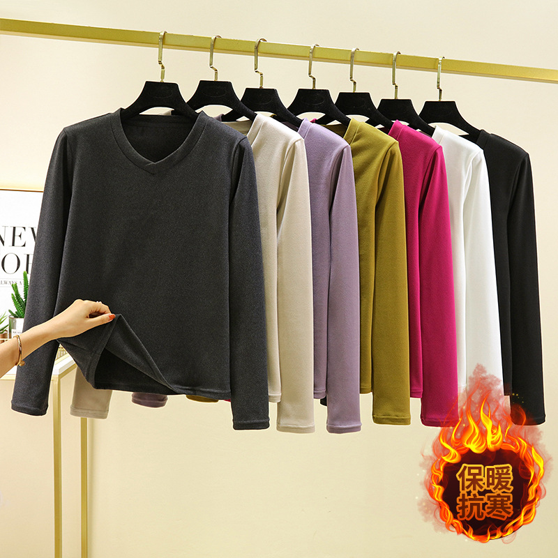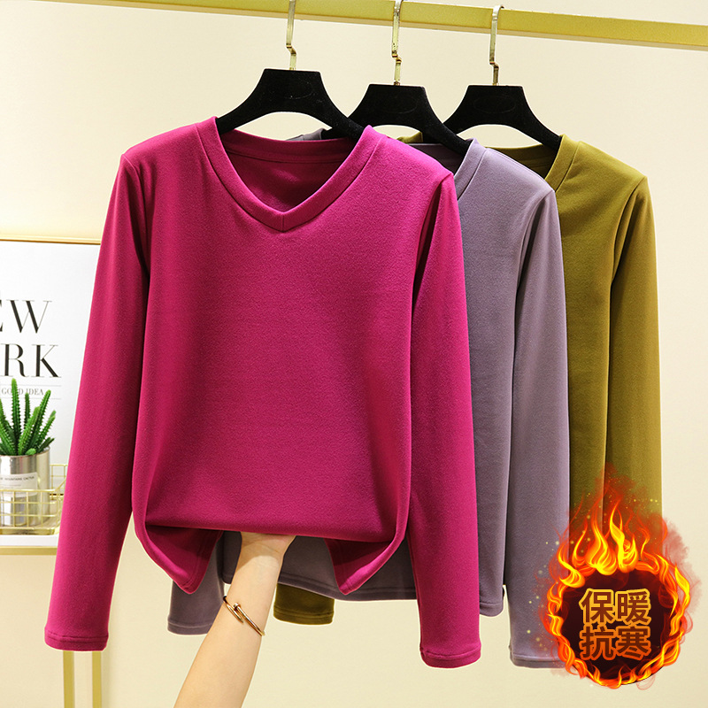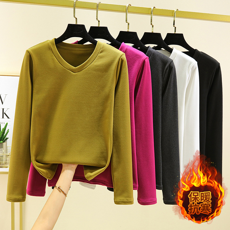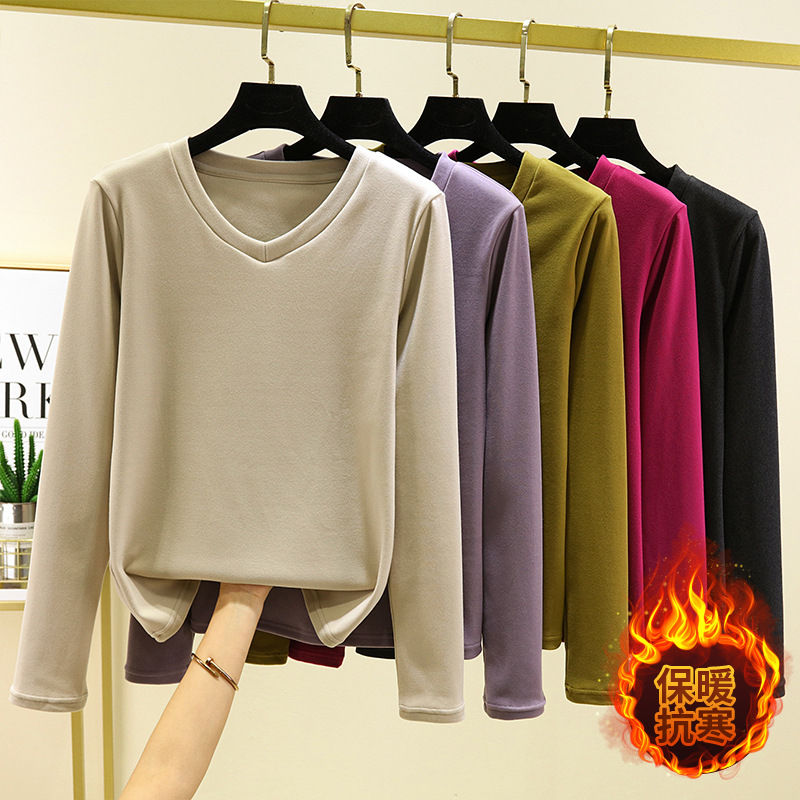 Double-sided Velvet New V-neck Base Shirt Irregular Bottom Slimming Long Sleeve Sanding Warm Solid Color Slim Fit Inner T-shirt
