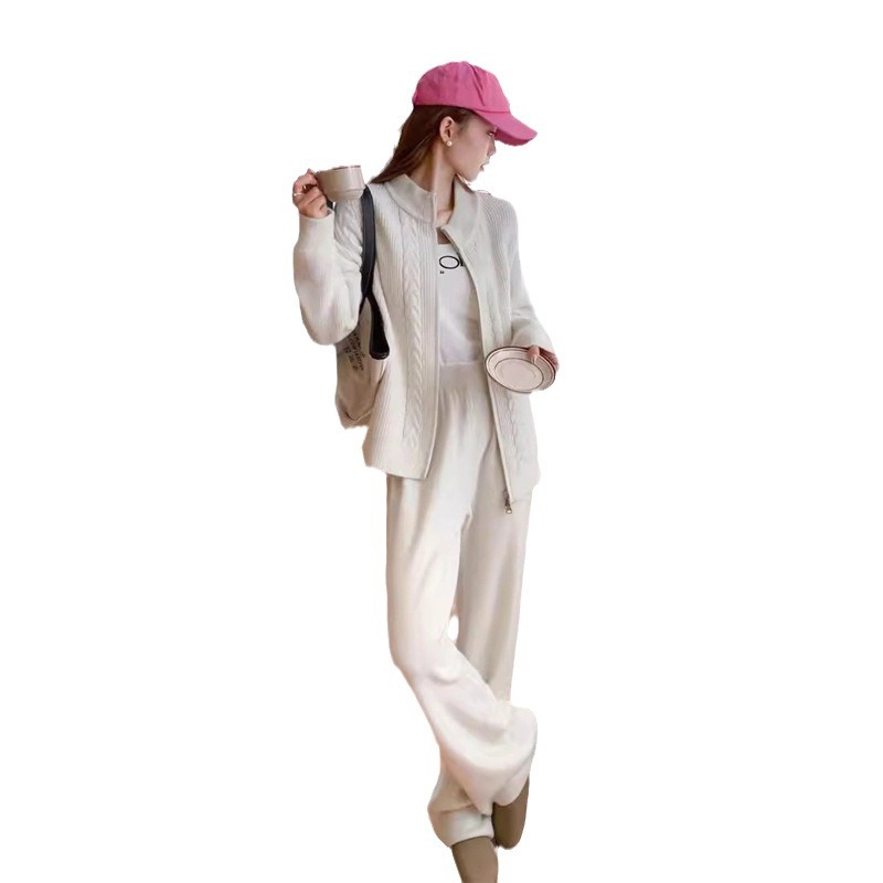 Double Zipper Sweater suit Women’s Autumn and Winter New Korean-style Loose Retro Twist Knitted Cardigan Wide-leg Pants Two-piece Set
