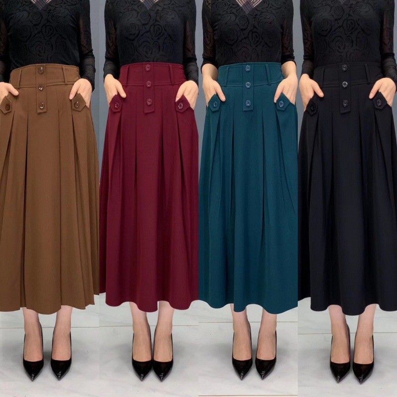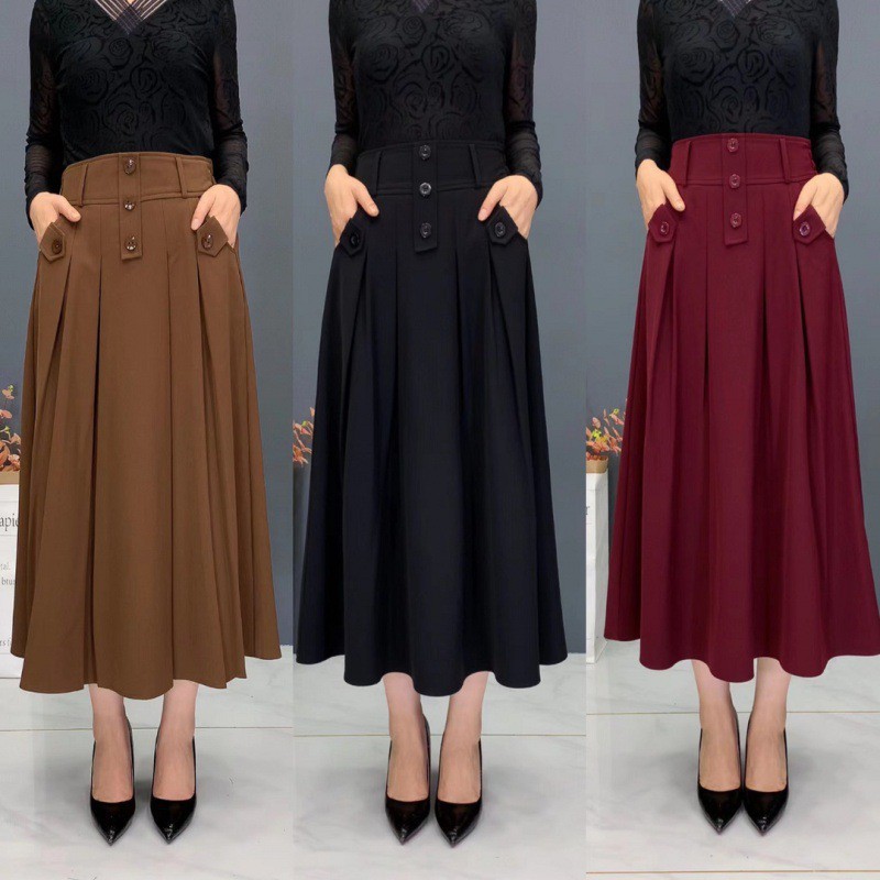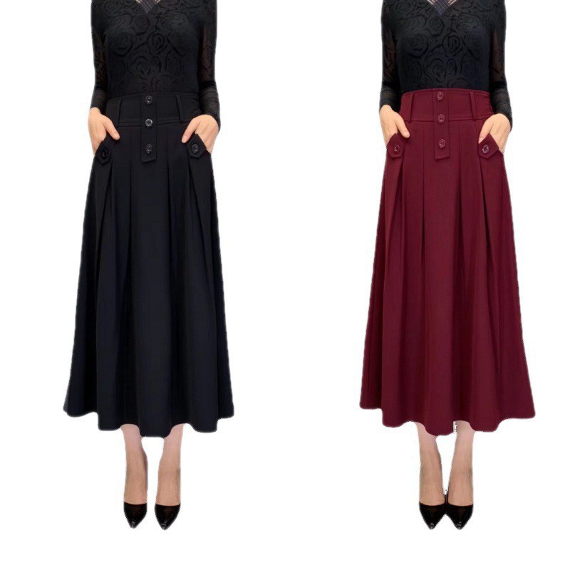 | nameOriginal | Draping skirt for women 2023 spring new fashion elastic waist three-button high waist slimming casual midi skirt |