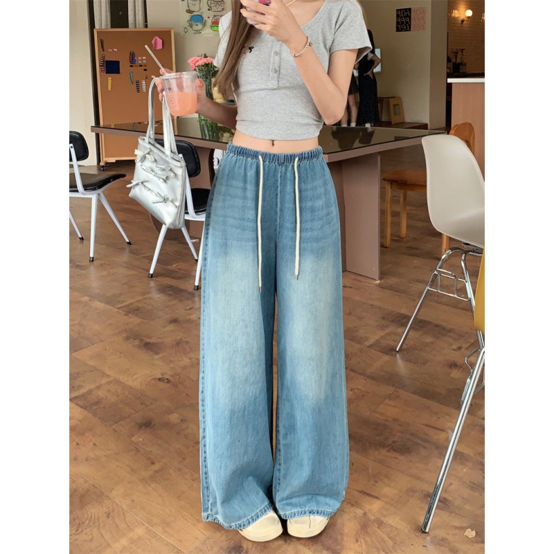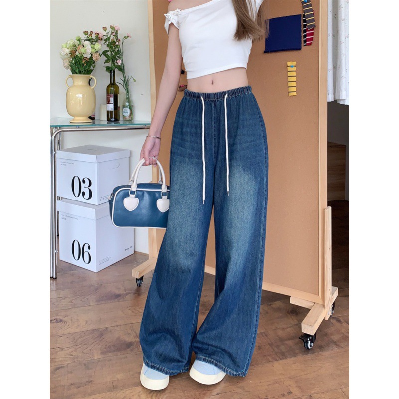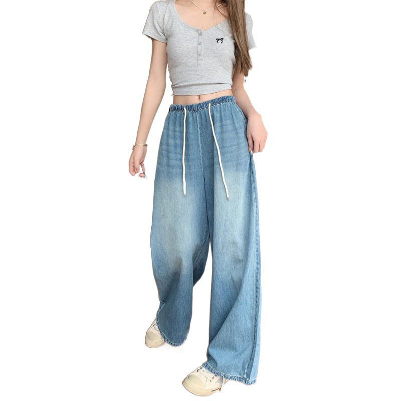 Drawstring Student Women’s Jeans Summer Thin Elastoelastic Waist Loose Straight Leg Wide Leg Pants plus size Chubby Sister Casual Trousers