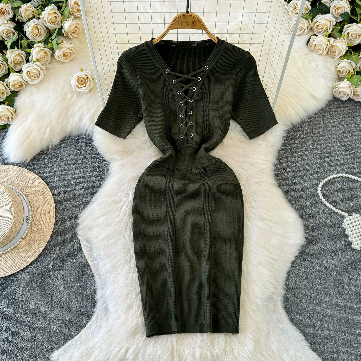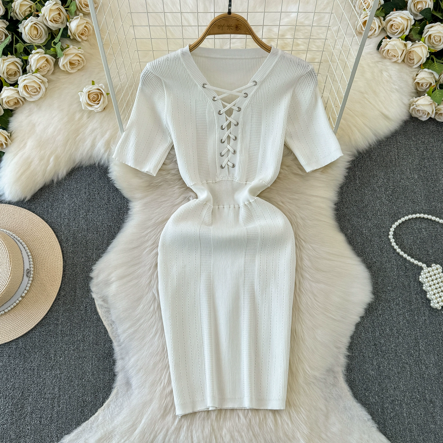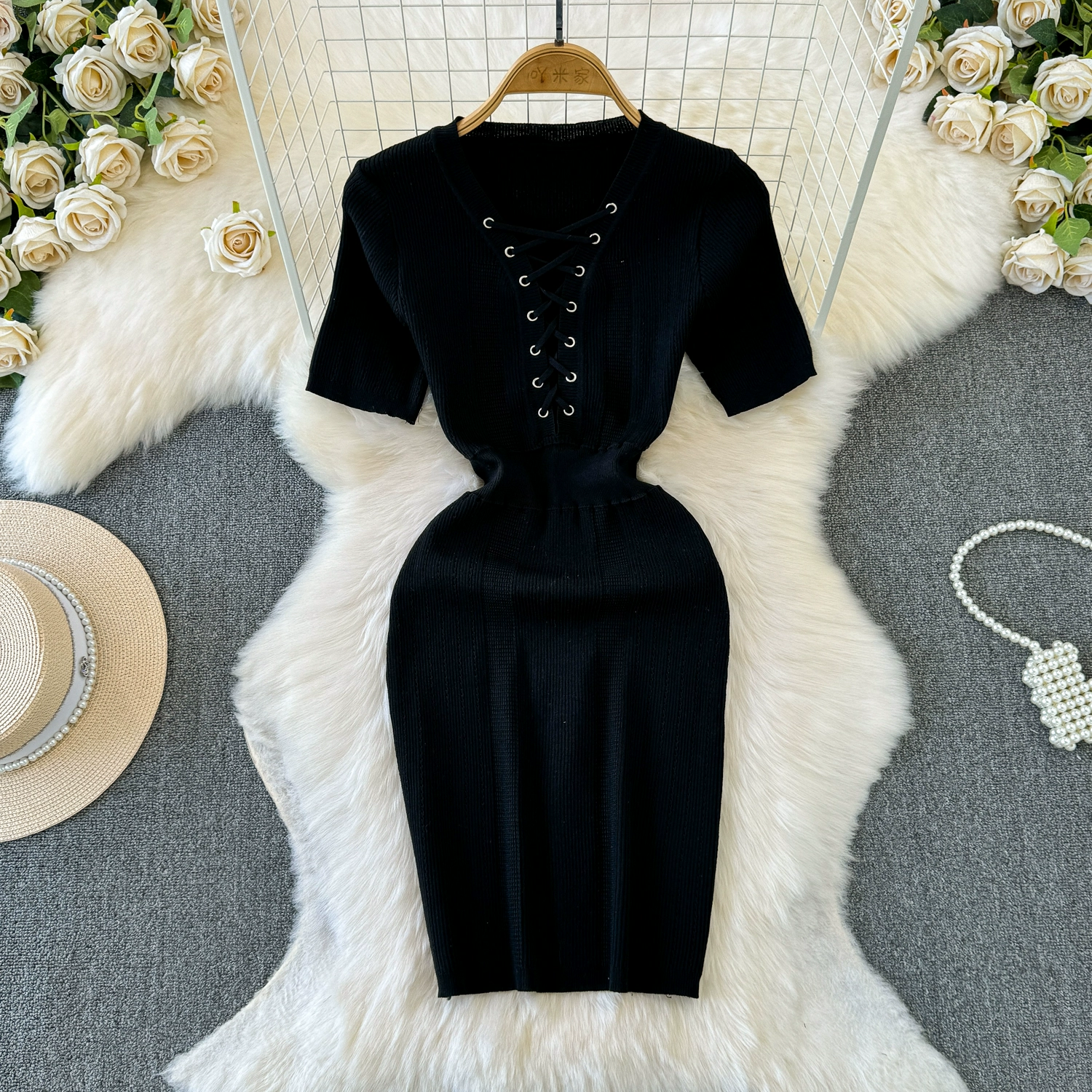 | nameOriginal | Dress for women summer Korean style v-neck pure lust design lace-up short-sleeved knitted skirt hot girl sexy hip-covering short skirt |