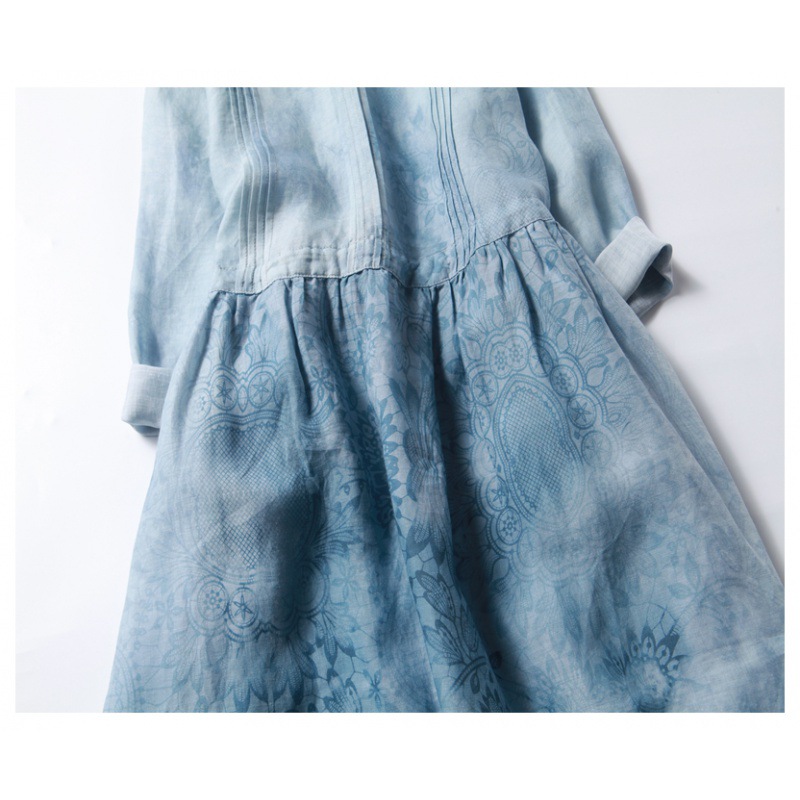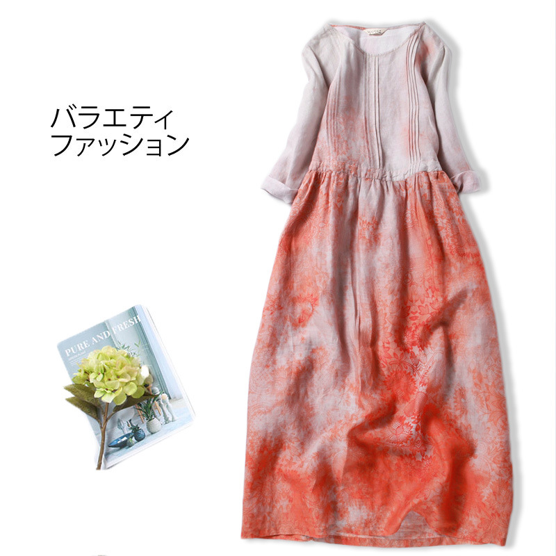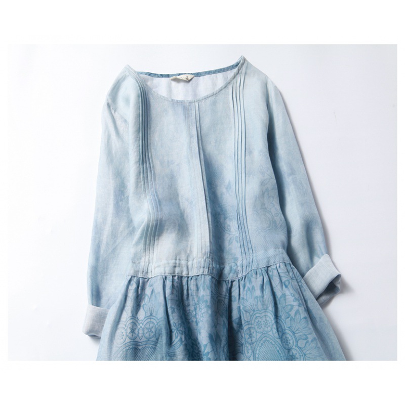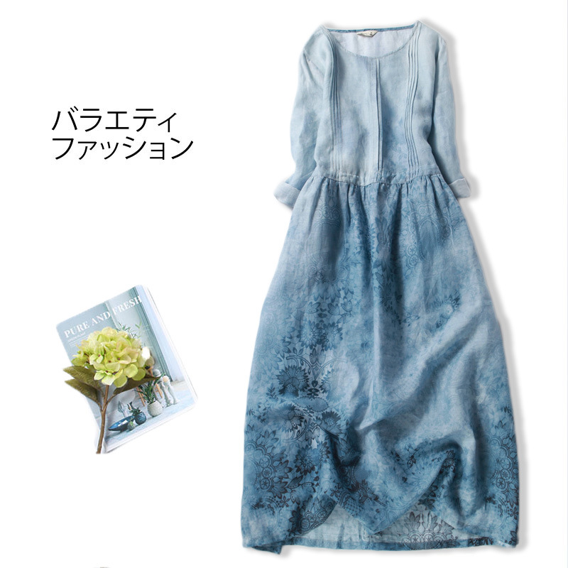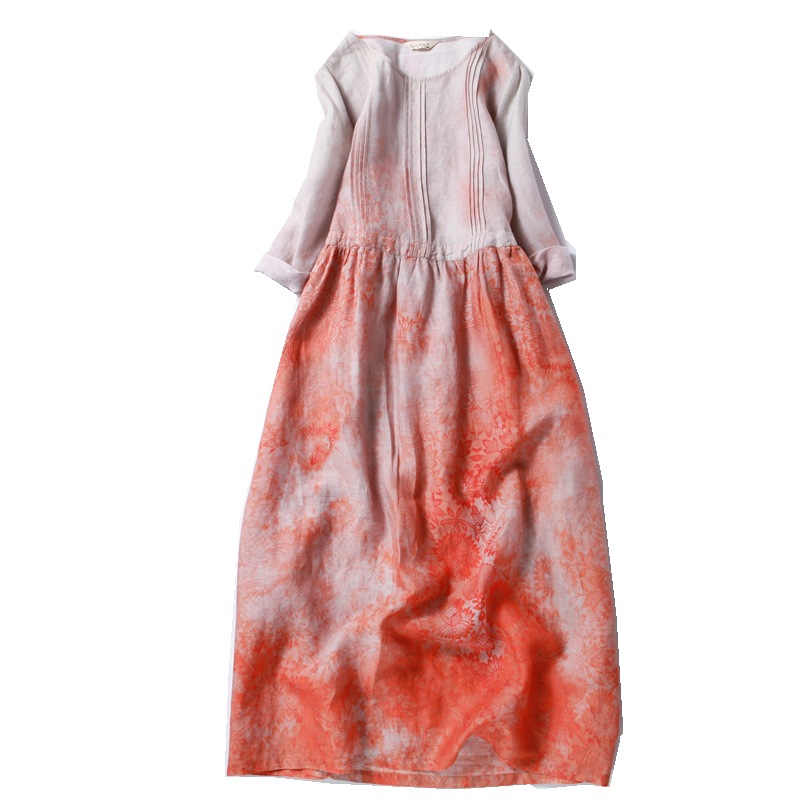 | nameOriginal | Dress Ramie Printed Round Neck Seven-point Sleeve High Waist Slimming Belt Spring and Summer Mid-length Artistic Linen Large Swing Dress |