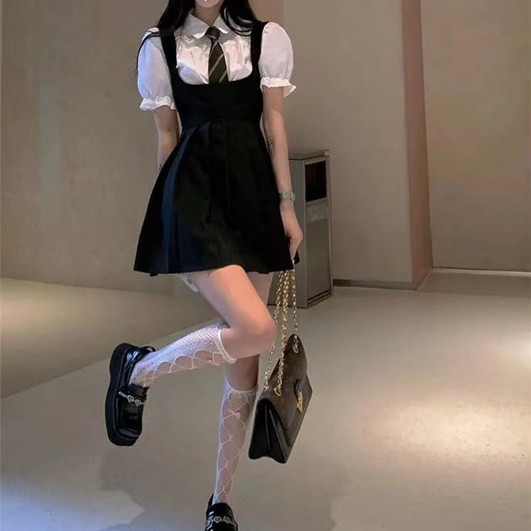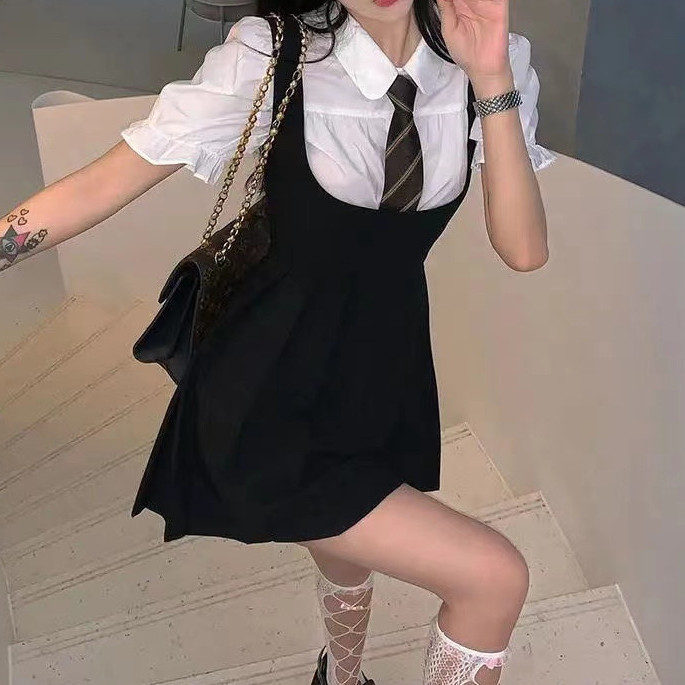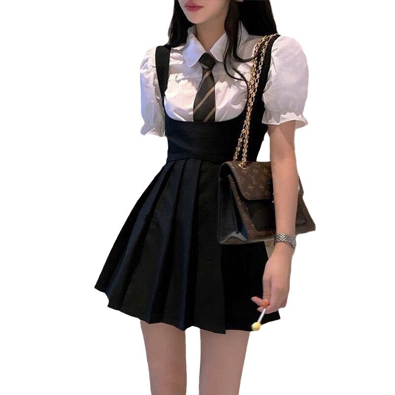 | nameOriginal | Dress Set Women's Summer High Street Spice jk Uniform Sling Pleated Skirt Puff Sleeve Shirt Two-piece Set |