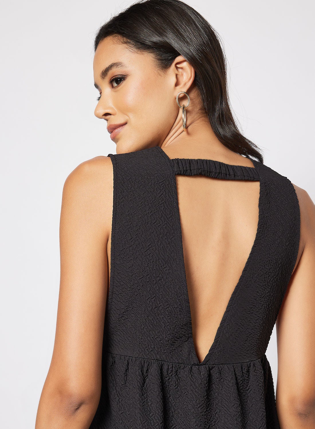 This product features a comfortable yet sturdy polyester material with a deep V-neck and sleeveless design. It also includes an elastic band on the back for a personalized fit, as well as cutlines at the waist and a cut-out detail on the back. Please follow the care label instructions when washing. The model is approximately 179cm tall and is wearing a size S.