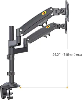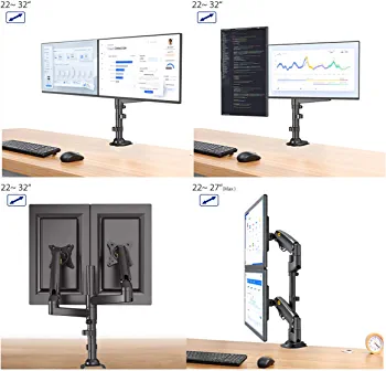 Dual monitor mount for 22-32 inch screens with adjustable height and full motion support. VESA compatible with 75/100mm and can hold up to 26.4lbs per monitor.
