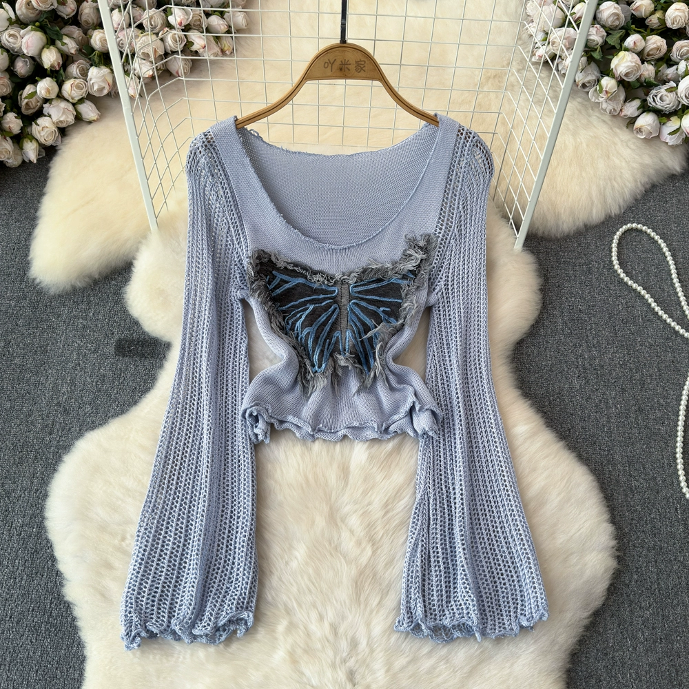 | nameOriginal | Early autumn new chic butterfly patch hot girl bottoming shirt top women's design hollow bell sleeve short T-shirt |
