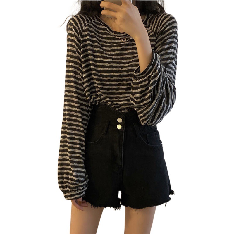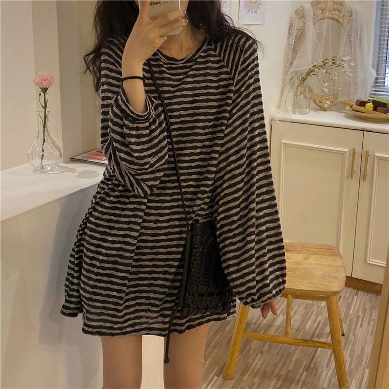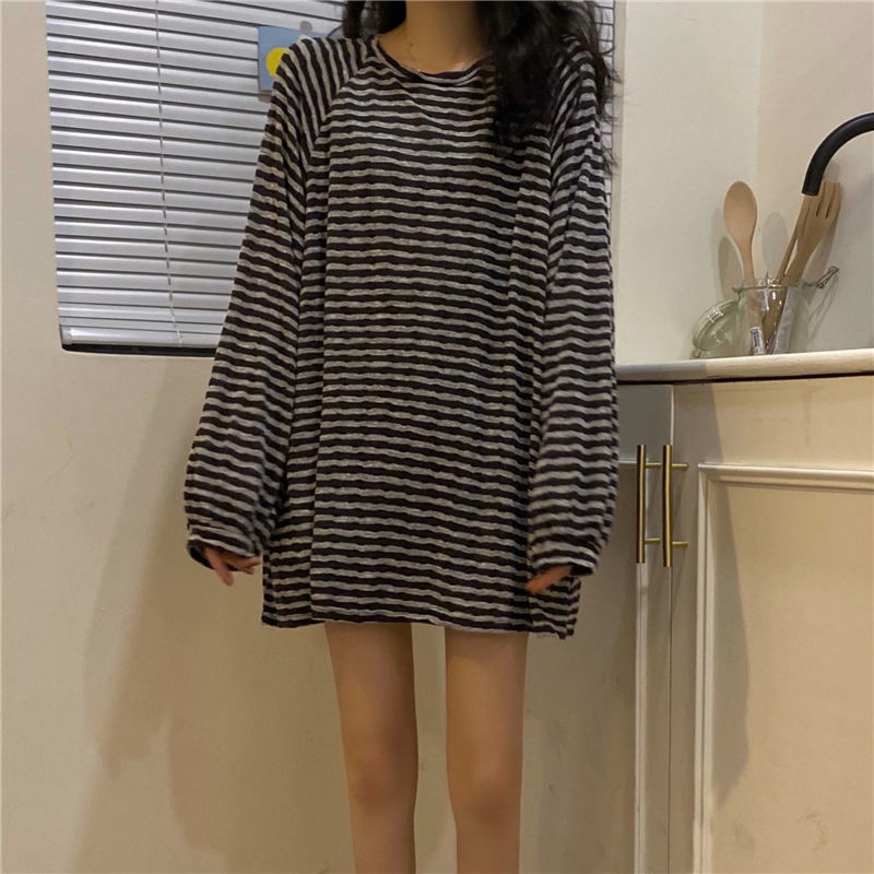 Early autumn versatile striped long-sleeved top T-shirt female students Korean style loose Harajuku lazy ins style autumn undershirt