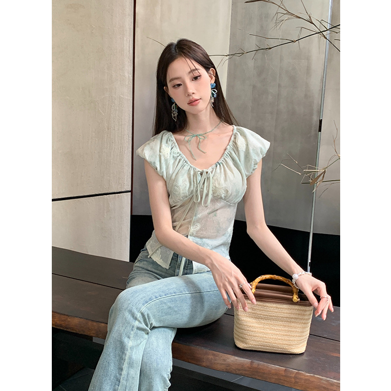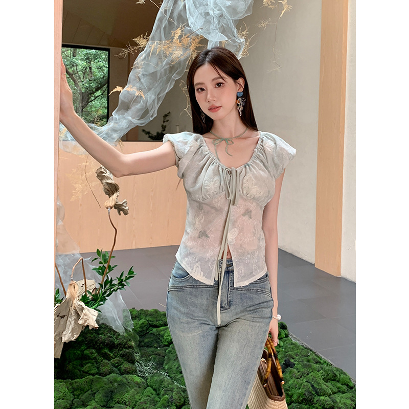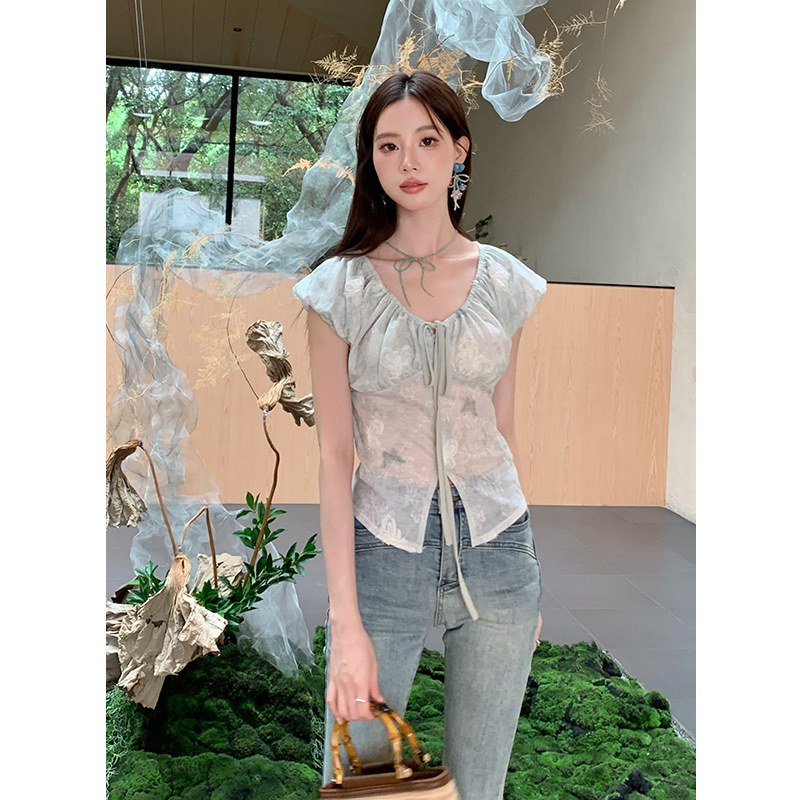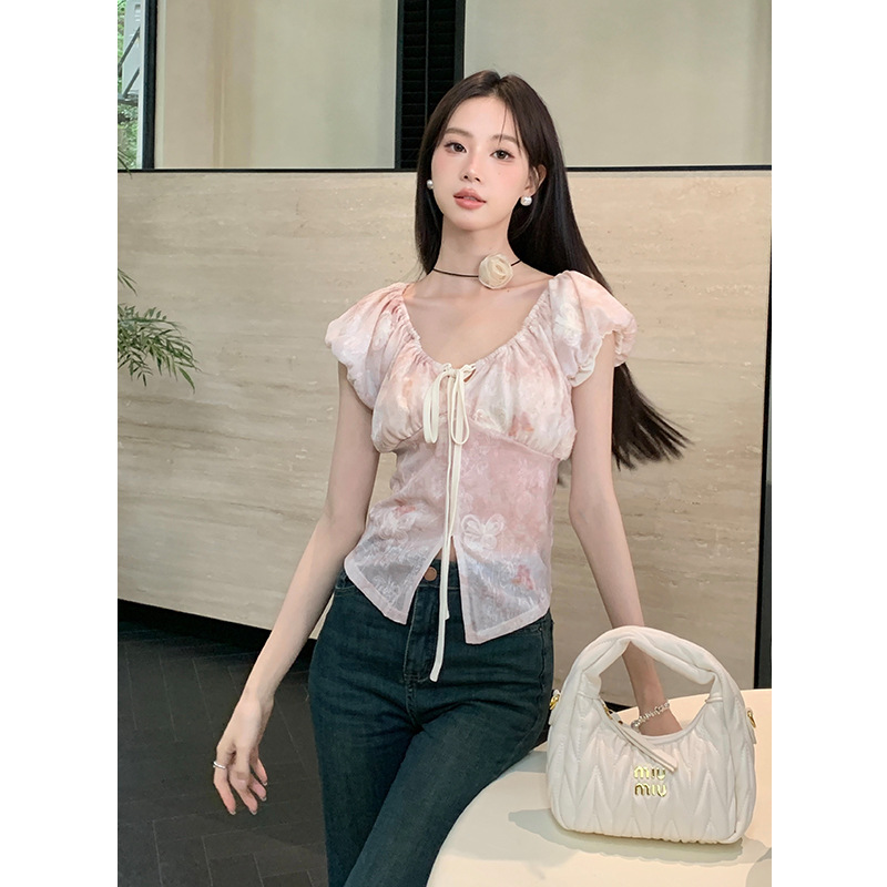Early French Style Elegant Butterfly Print V-neck Top Women’s 2024 Summer New Style Elegant Floral Short-sleeved Chiffon Shirt