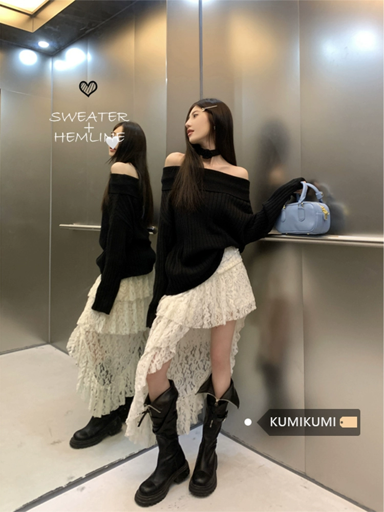 Early spring one-shoulder lace crochet pure lust knitted sweater