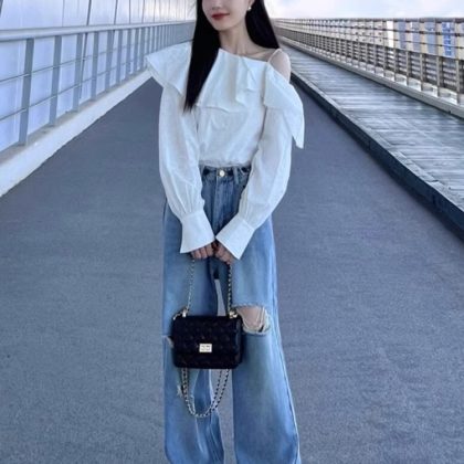 | nameOriginal | Early spring women's tea department wear a set of small salt line light cooked fried street net red casual jeans suit |