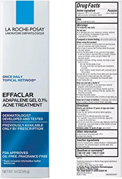 | nameOriginal | La Roche-Posay Effaclar Adapalene Gel 0.1% Acne Treatment, Prescription-Strength Topical Retinoid Cream For Face, Helps Clear and Prevent Acne and Clogged Pores |
