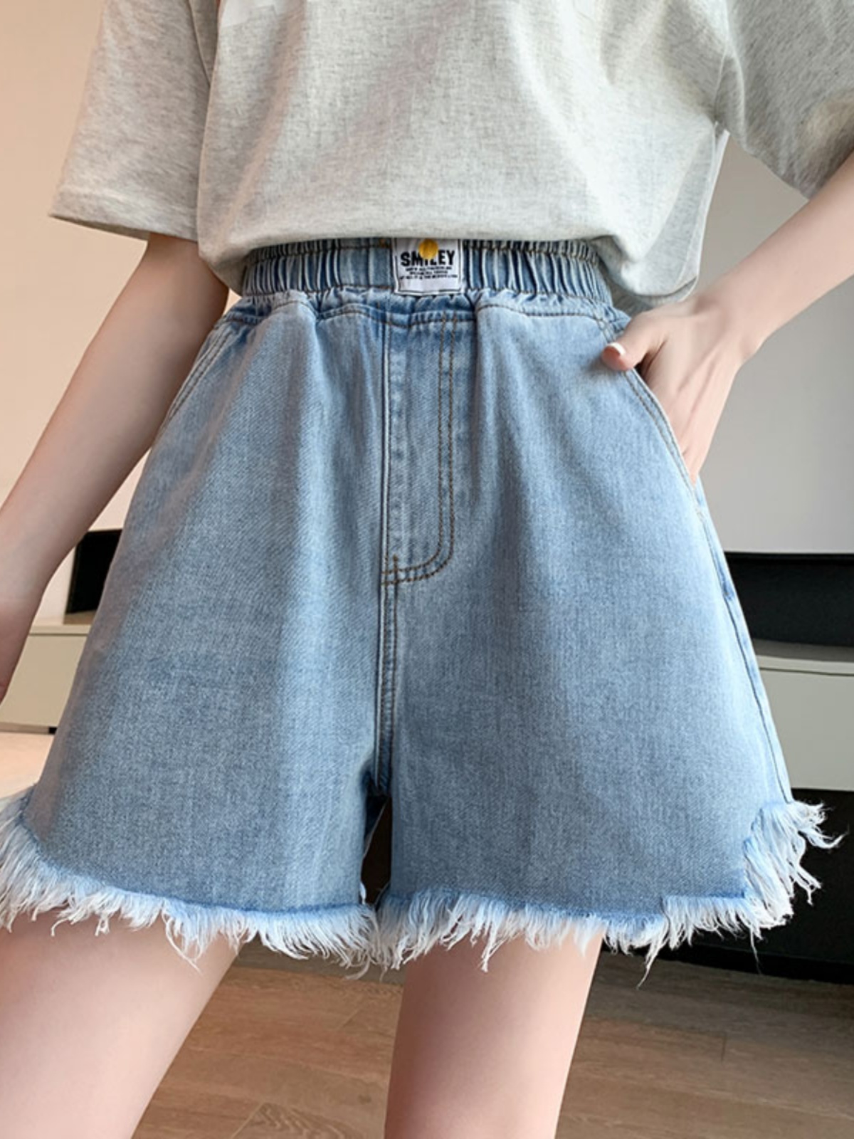 Elastic waist plus size fat mm wide leg raw edge denim shorts