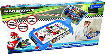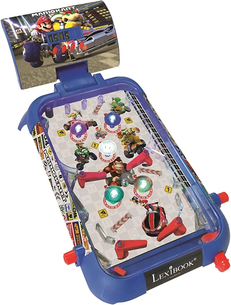Electronic pinball game with Mario Kart theme, LCD screen, light and sound effects, suitable for children and families. Available in blue/red color (JG610NI).