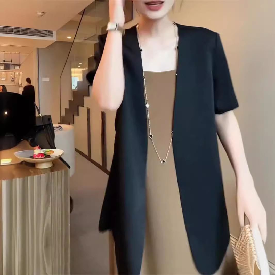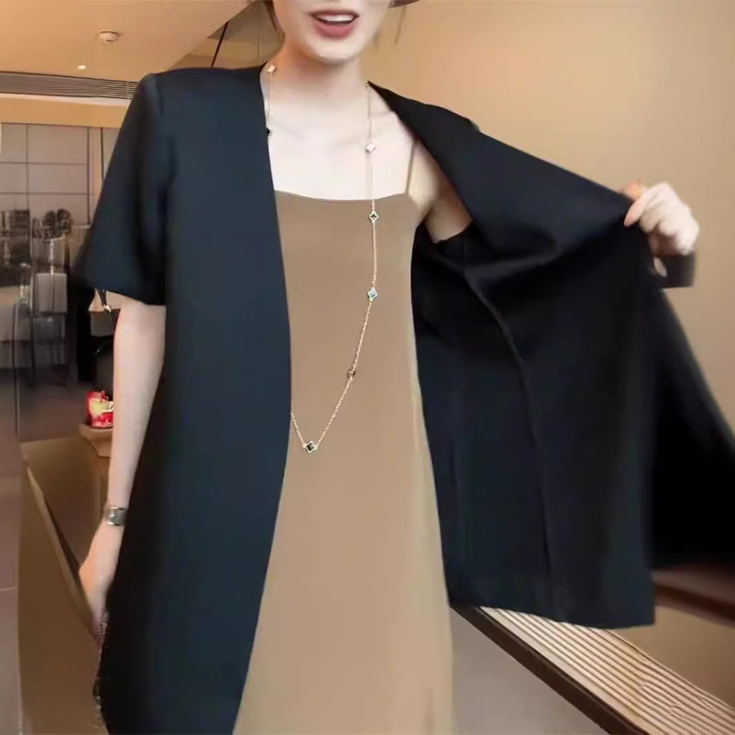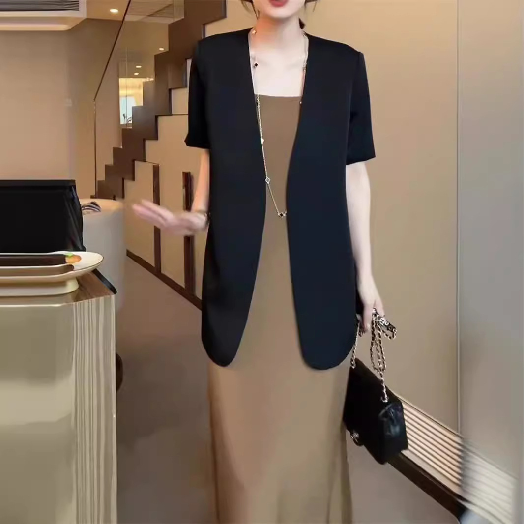 Elegant Black Thin Short-sleeved Suit Top Women's suit 2024 New Summer Slim-fit Sleeveless Strap dress Trendy