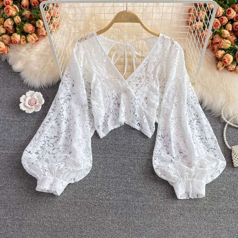 | nameOriginal | Elegant hollow lace shirt with long sleeves and backless crochet |