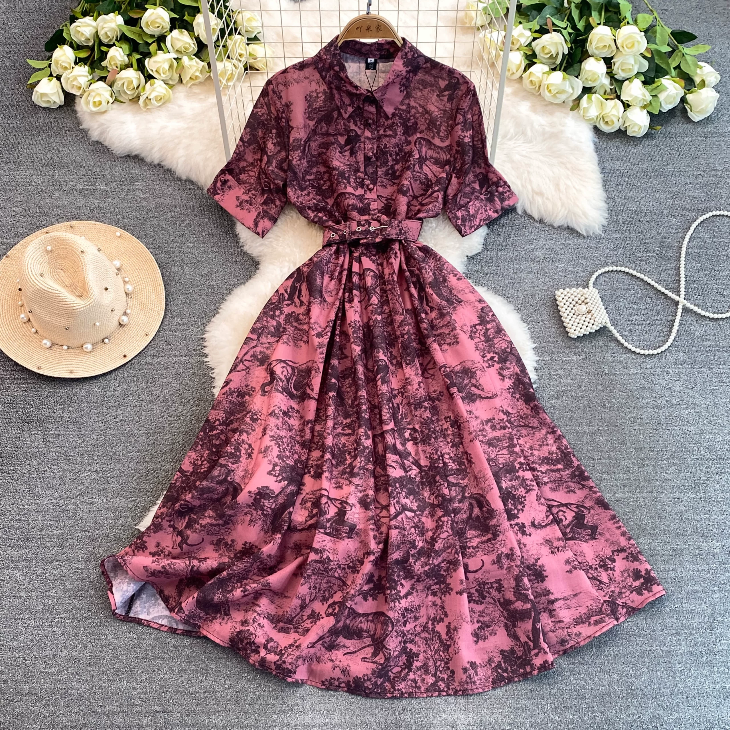 Elegant long-sleeved dress with ink painting print