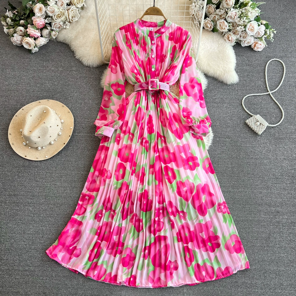 Elegant long-sleeved pleated dress with stand-up collar and wide skirt