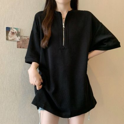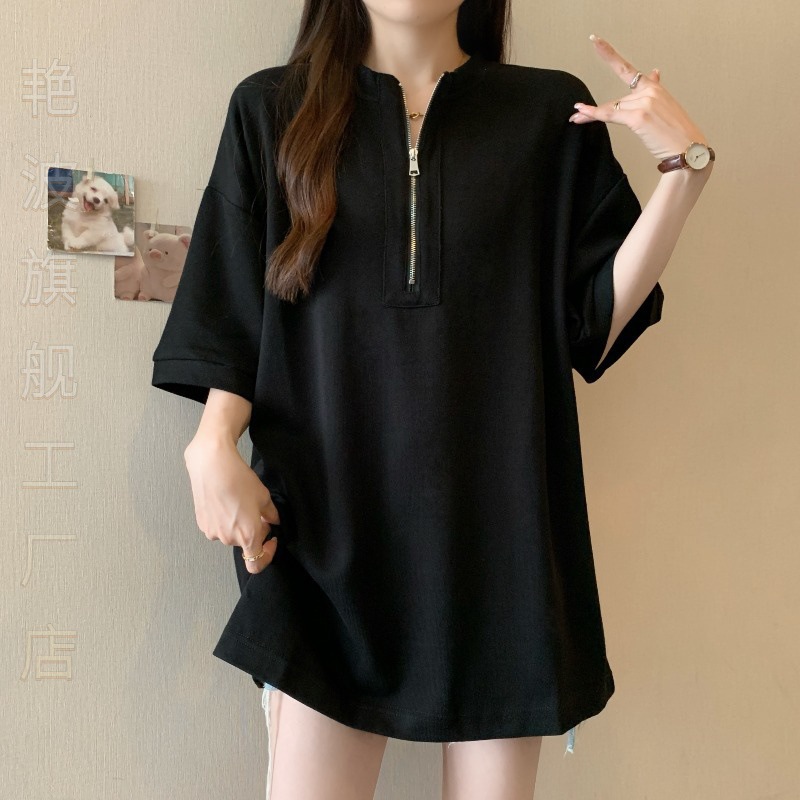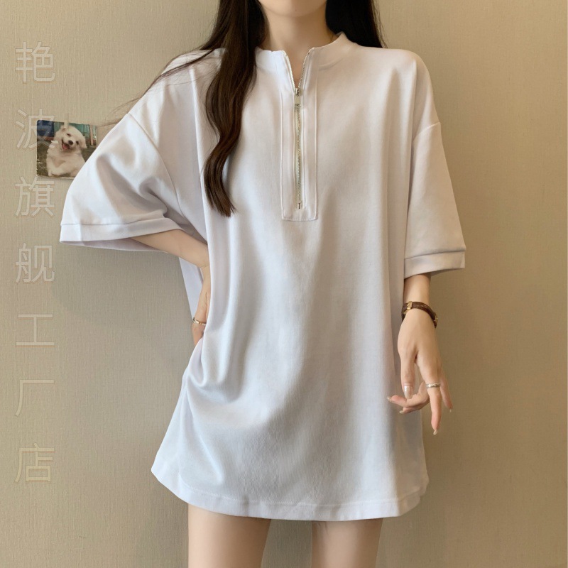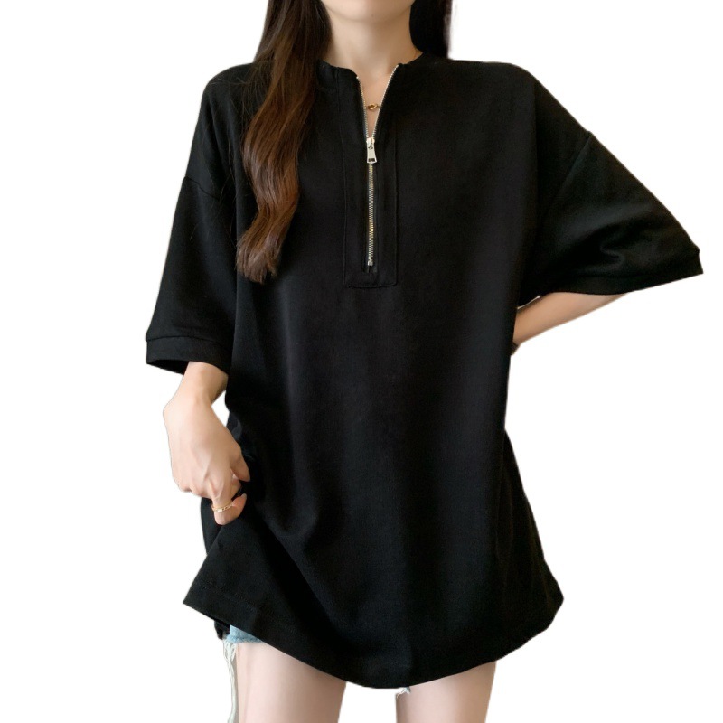 | nameOriginal | Elegant Mid-length Half-zipper Half-sleeve Shoulder Short-sleeve T-shirt Women's Summer Loose plus size Covering Taste on Butt |