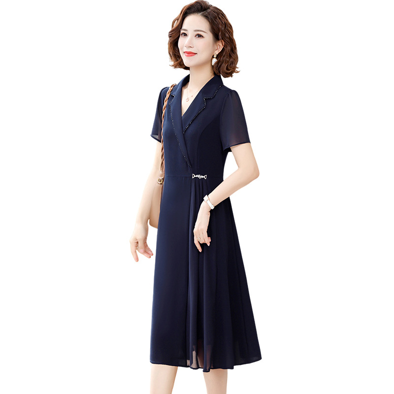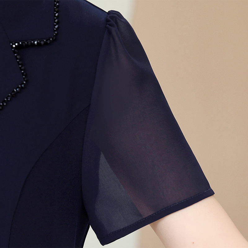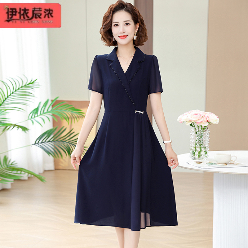 Elegant Mother's Summer Dress Beaded Fashion dress 45-year-old Middle-aged Women's Wear Dress Collar Thin Short-sleeved Mid-length Dress for Women