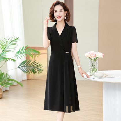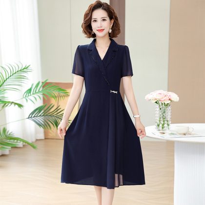 Elegant Mother’s Summer Dress Beaded Fashion dress 45-year-old Middle-aged Women’s Wear Dress Collar Thin Short-sleeved Mid-length Dress for Women