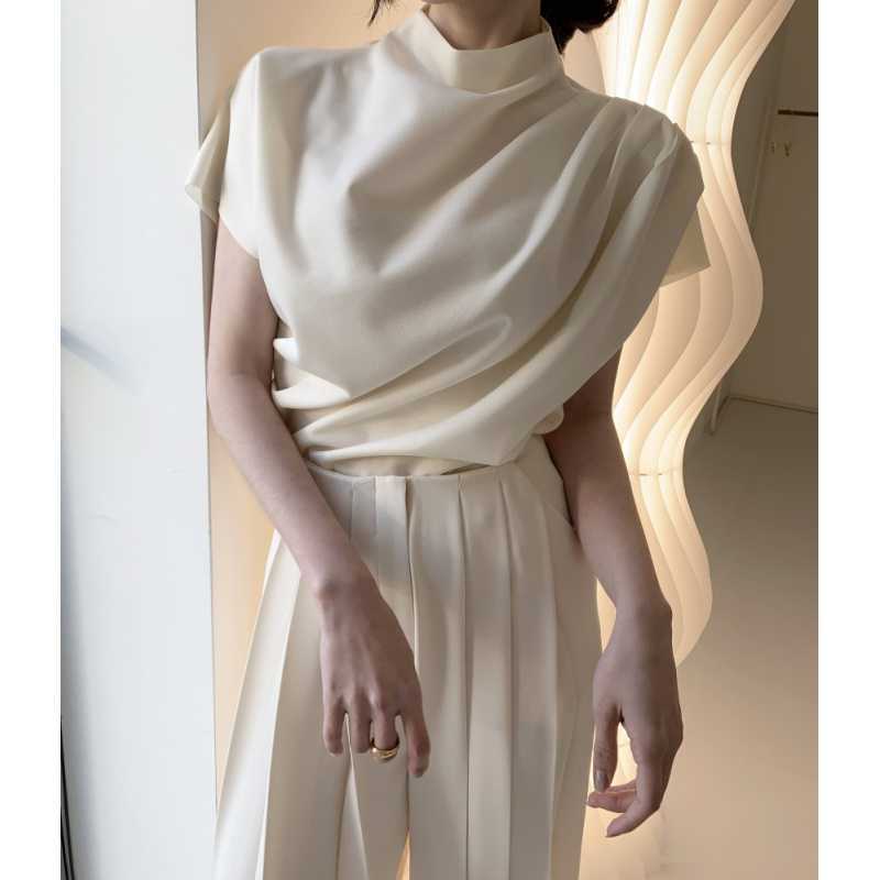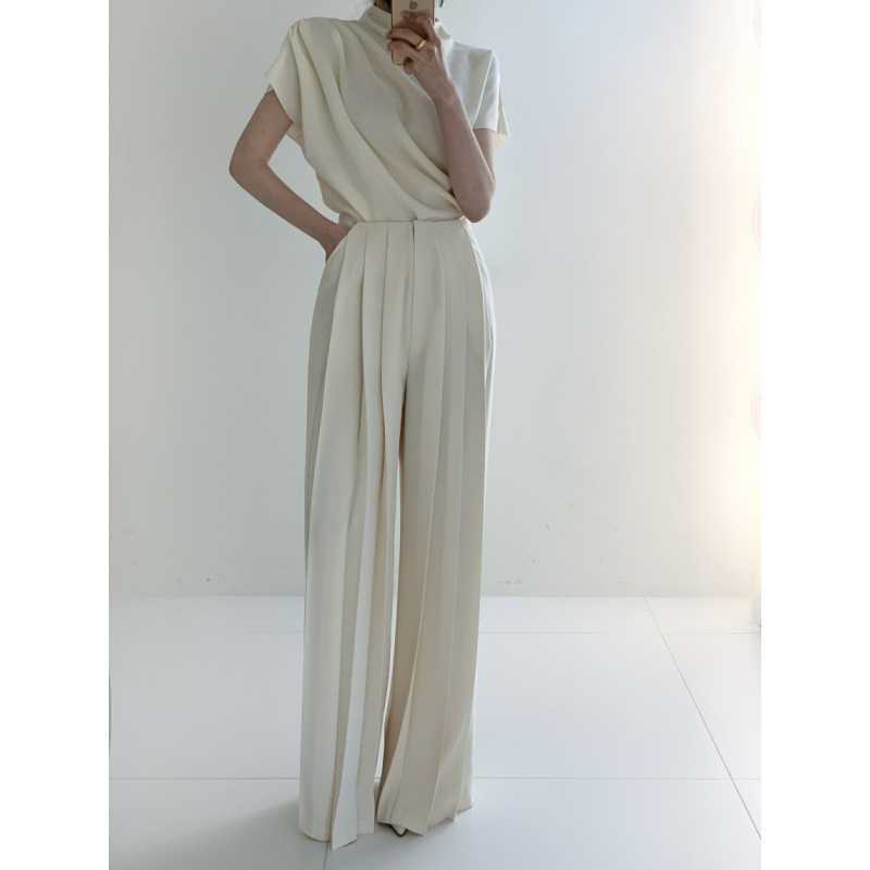 | nameOriginal | Elegant Pearl White Small Stand Collar Oblique Pleated Design Top High Waist Pleated Casual Pants Trousers |