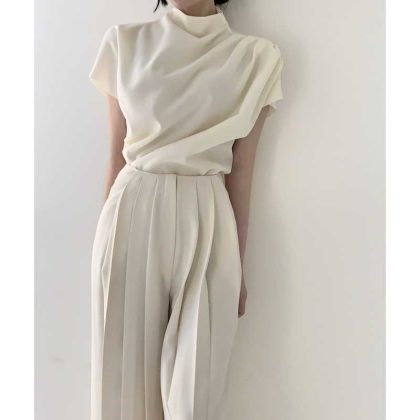 | nameOriginal | Elegant Pearl White Small Stand Collar Oblique Pleated Design Top High Waist Pleated Casual Pants Trousers |