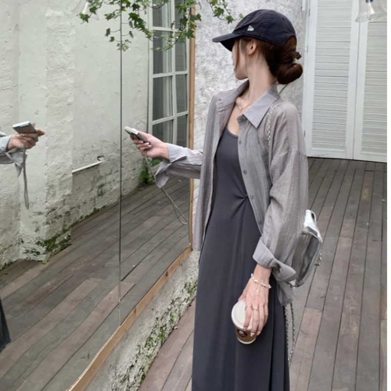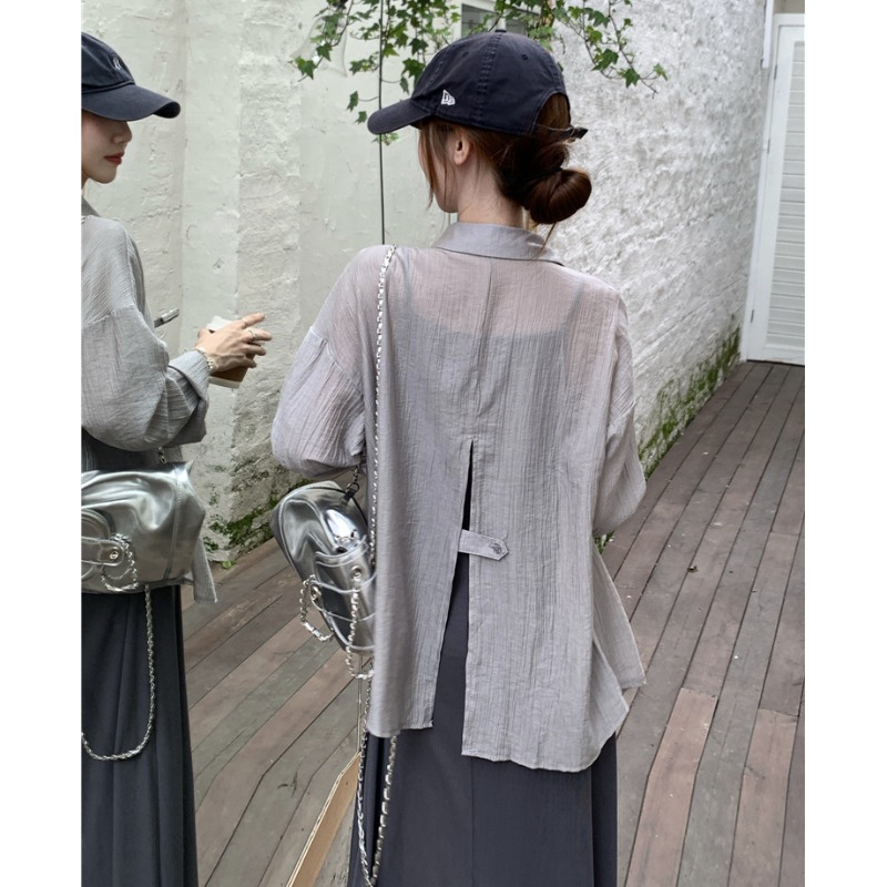 Elegant Polo Collar Gray Long-Sleeved Sunscreen Shirt Women’s Summer Niche Design Sense Back Split Thin Jacket