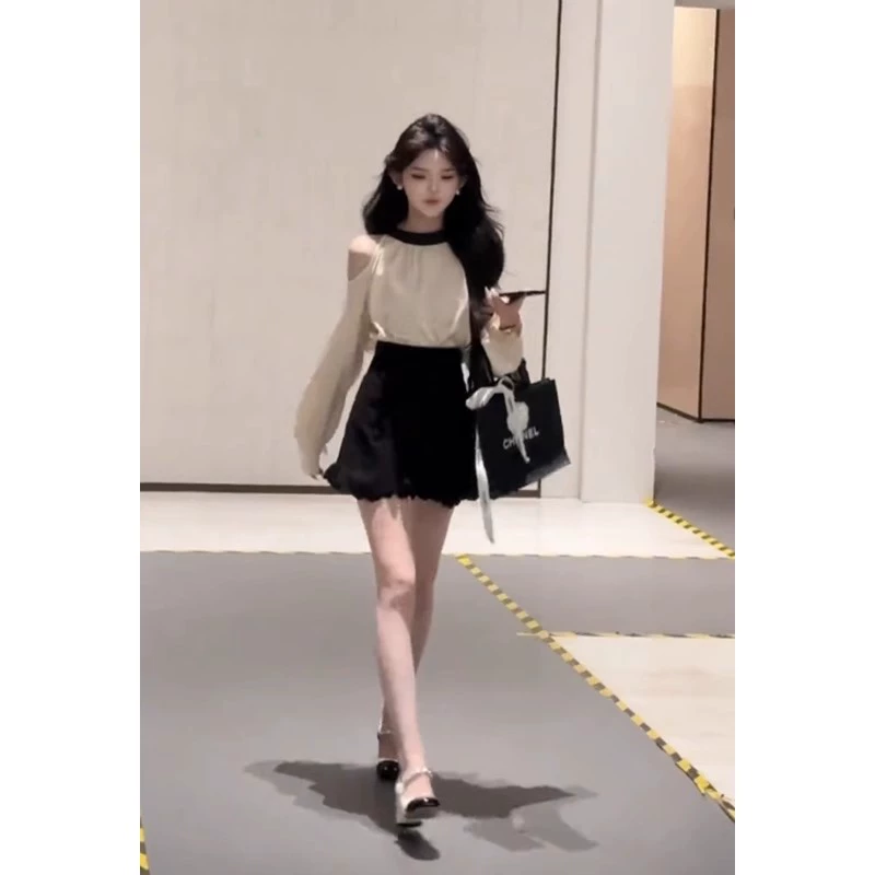 Temperament lady pure desire off -the -shoulder two -piece chiffon shirt