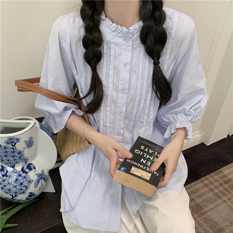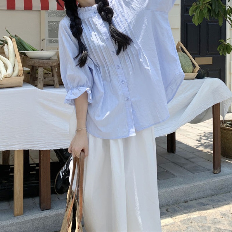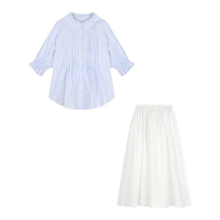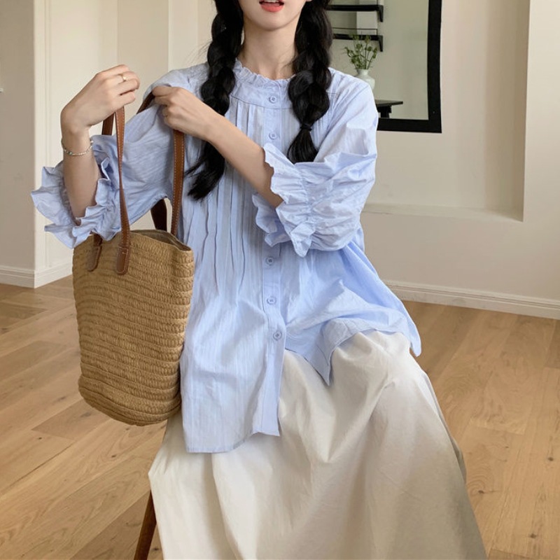 | nameOriginal | Elegant Sweet Blue Lantern Sleeve Shirt Women's Spring and Autumn Design Sense Wood-ear Edge Shirt Loose Skirt Two-piece Set |