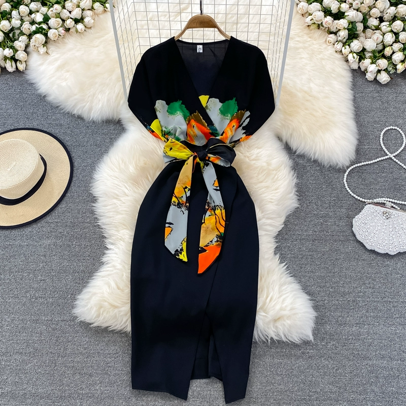 | nameOriginal | Elegant V-neck dress with waist tie |