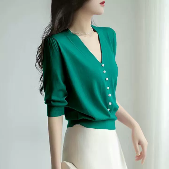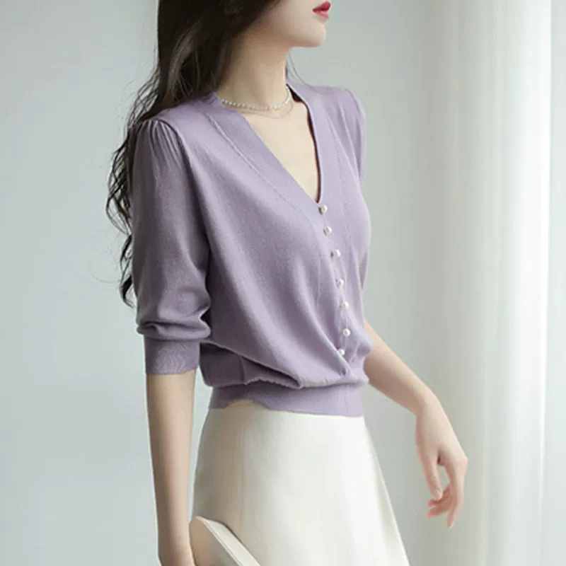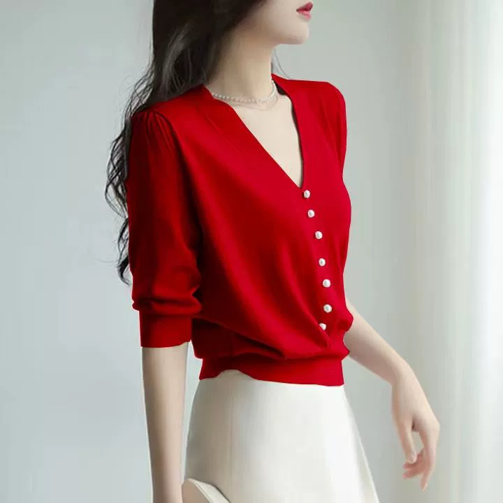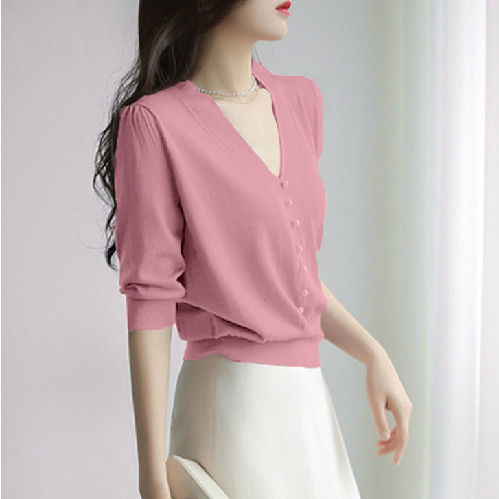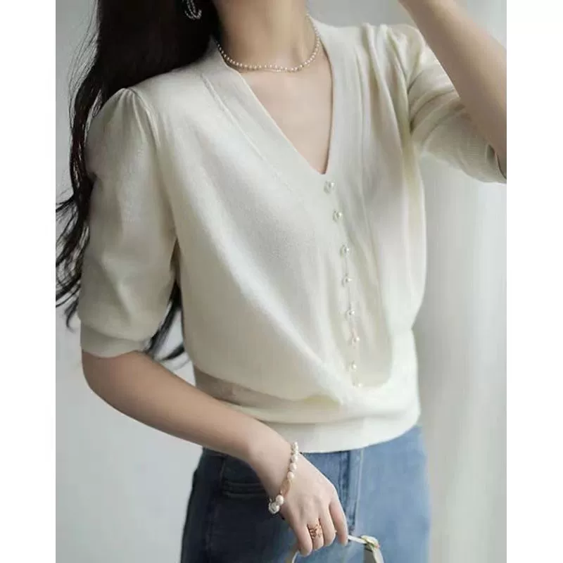 | nameOriginal | Elegant V-neck knitted bottoming shirt with pearl buttons |