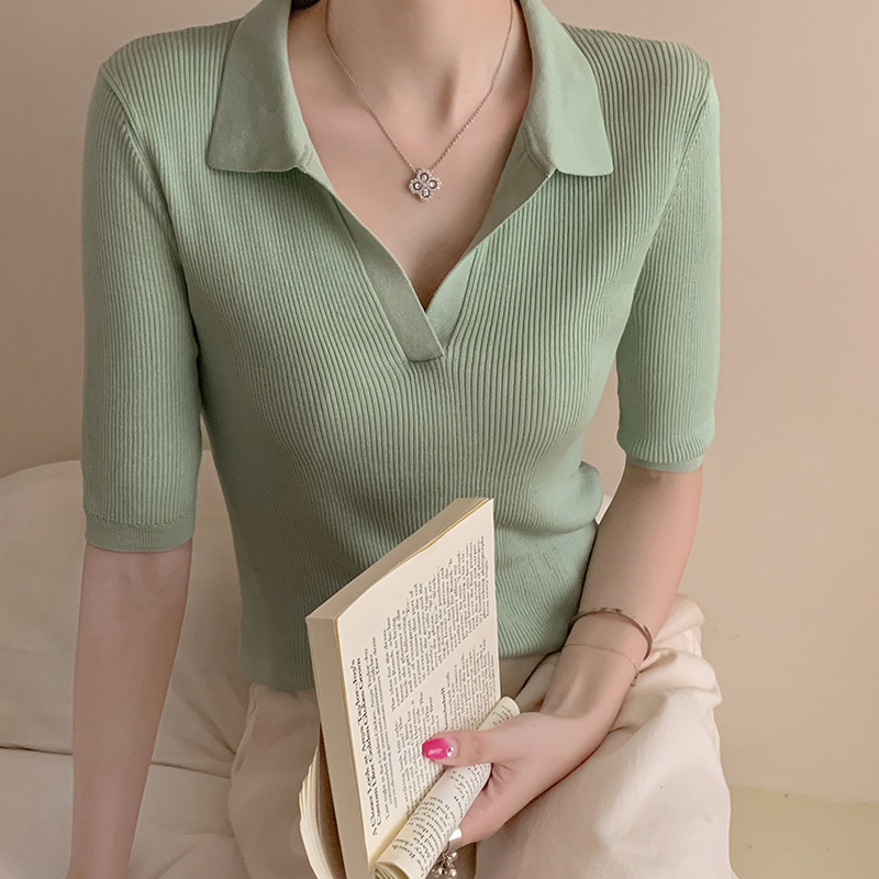 Elegant wear polo short-sleeved T-shirt women’s 24 spring and summer ice silk refreshing solid color short V-neck outer wear knitted top