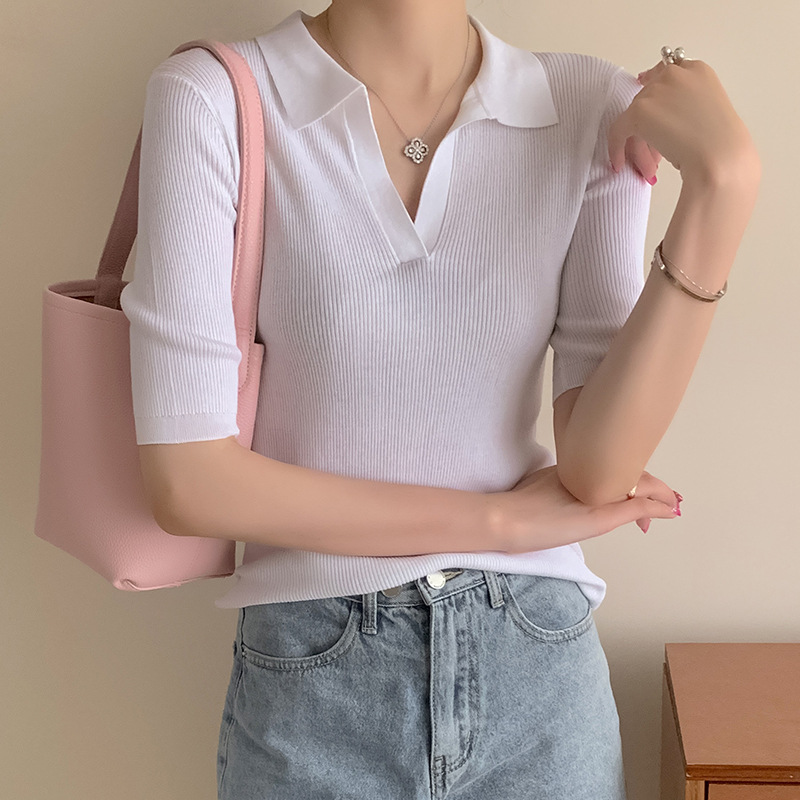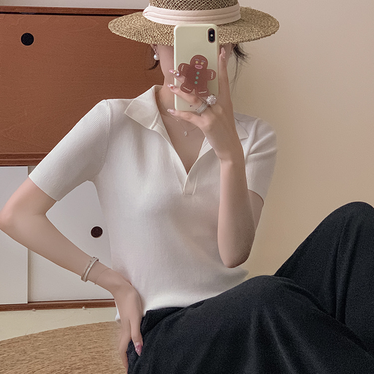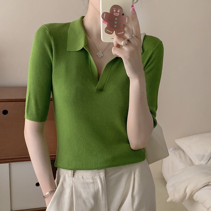 Elegant wear polo short-sleeved T-shirt women's 24 spring and summer ice silk refreshing solid color short V-neck outer wear knitted top