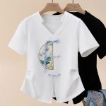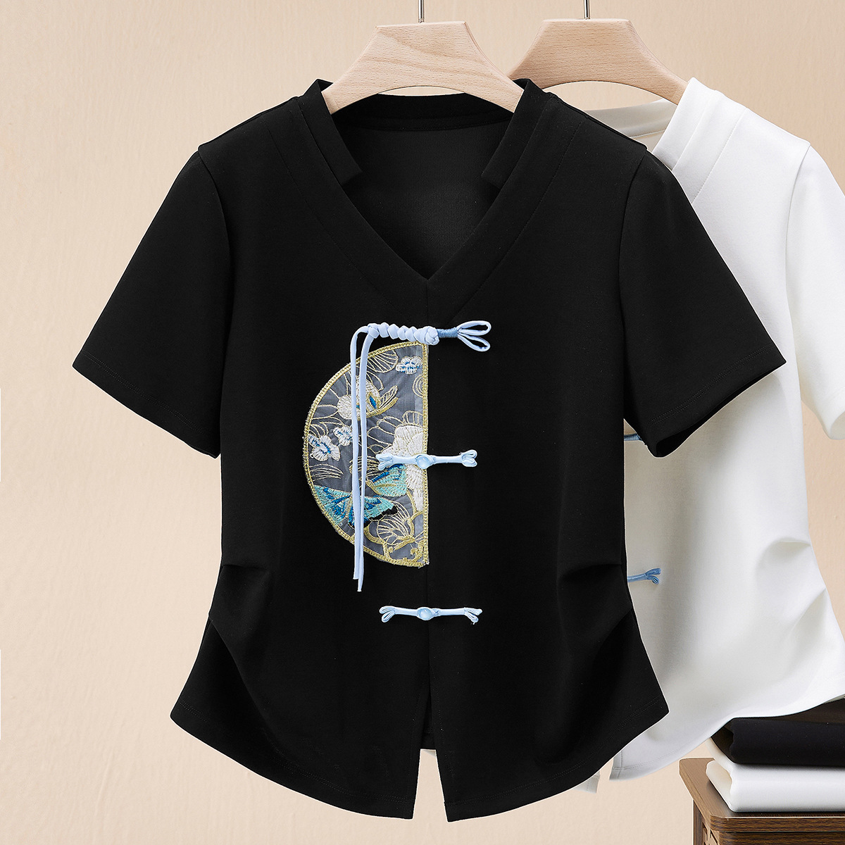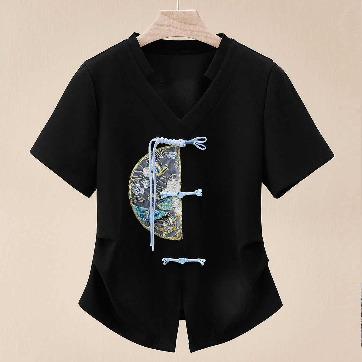 Embroidered Chinese-style Short-sleeved T-shirt Women’s Summer Slim-fit Tight Waist Slimming Shoulder Irregular Design V-neck 1688 Top
