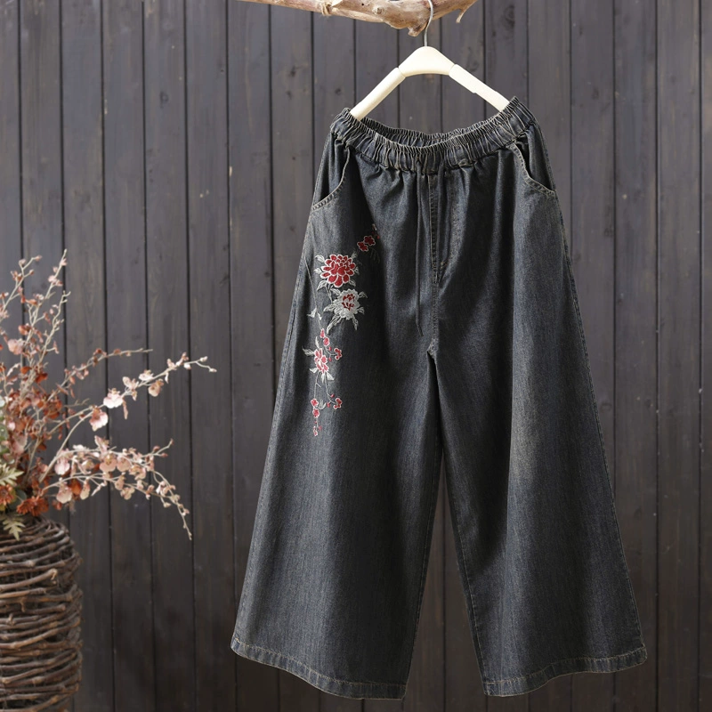| nameOriginal | Embroidered elastic waist spring and summer wide leg pants with nine points of art |